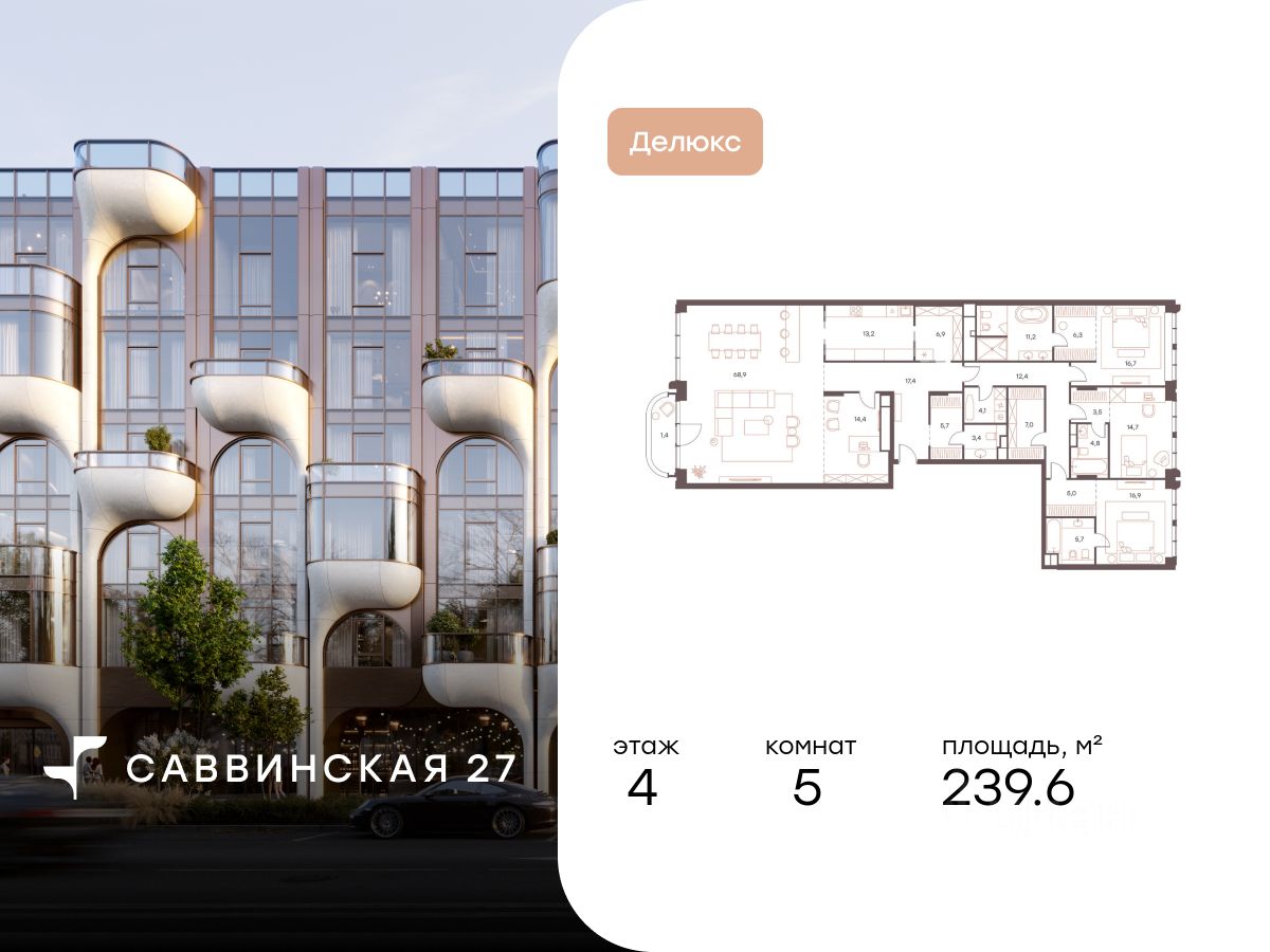 В историческом районе Хамовники продаются 5-к апартаменты площадью 239.60 кв.м, расположенные на 4 этаже делюкс-резиденции Саввинская 27. Преимущества: - 51 апартамент и 10 пентхаусов площадью 83-346 м2 с возможностью перепланировки и объединения, - все апартаменты с видом на Москву-реку, - бассейн 25 метров, тренажёрный зал, зал для занятий йогой и пилатесом, - бизнес-лаундж с отдельными переговорными, - детская комната с выходом во внутренний двор, - зимний сад, - библиотека с настоящим дровяным камином, - салон красоты и спа премиум-класса Mahash Spa, - подземный паркинг на 91 машино-место, - ресторан с летней террасой, - продуманное благоустройство на закрытой территории с охраной и видеонаблюдением, с детской площадкой и местом для тихого отдыха. Расположение и инфраструктура: Дом построен именно в Хамовниках неслучайно, ведь это стиль жизни, к которому вы привыкли: лучшие школы, спортивные секции, места для отдыха, прогулок и комфортная логистика до исторического центра или Москва-Сити. - 2 минуты до Садового кольца и 6 минут до ТТК на машине, - 11 минут пешком до ''Лужники'', - 20 минут пешком до станции метро ''Спортивная'', - в окружении более 15 детских садов, в том числе 9 частных, - в пешей доступности расположены 11 школ, 4 из которых входят в топ-20 школ Москвы по версии Forbes, - в окружении 5 парков, в том числе парк ''Новодевичьи пруды'', усадьба Трубецких, парк Горького. Отличная транспортная доступность: Еще одно преимущество резиденции - удобная транспортная доступность. Несмотря на близость к центру, путь на автомобиле до ТТК займет 2 минуты, до Садового кольца 5 минут. В пешей доступности находятся три станции метро: Спортивная, Фрунзенская и МЦК Лужники.