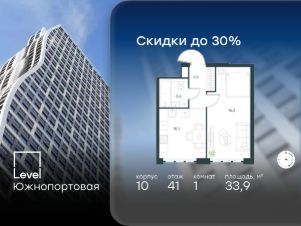 Цена указана с учётом скидки при 100%-й оплате, несубсидированной ипотеке, рассрочке (кроме программы ''Рассрочка 0%'').В северной части района Печатники продается 1-комнатная квартира площадью 33.90 кв.м без отделки. Квартира расположена на 41 этаже 68-этажного корпуса 10 в жилом комплексе комфорт-класса Level Южнопортовая (компания Level Group/Левел групп). Отличная транспортная доступность:- 10 мин. пешком до станции метро ''Кожуховская'',- 20 мин. пешком до станции МЦК ''Дубровка'',- 3 мин. на авто до ТТК,- 13 мин. на авто до Садового кольца,- 15 мин. на авто до Бульварного кольца. Продуманный архитектурный проект:- авторская архитектура от бюро СПИЧ,- уникальные виды на реку, парки и достопримечательности города,- высота потолков в квартирах до 6 м,- окна высотой до 1,87 м с высоким коэффициентом сопротивления теплоотдаче. Расположение:Level Южнопортовая строится в северной части района Печатники - самой приближенной к центру. Здесь будет сформирован новый район ''Южный порт'', где построят крупный жилой и общественно-деловой центр, аналогичный Москва-Сити. В течение 10-12 лет в этом месте появятся не только жилые дома, но и развитая инфраструктура для жизни и работы. А еще совсем рядом находится набережная Москвы-реки, где планируется построить причалы для речных трамвайчиков и канатную дорогу.Уже сейчас вокруг жилого комплекса работают десятки магазинов и торговых центров, рядом расположено 6 парков, среди которых музей-заповедник ''Коломенское''. В 10 минутах пешком - 2 муниципальных и 2 частных детских сада, 7 общеобразовательных школ.Внутренняя инфраструктура:Для отдыха жителей в каждом корпусе предусмотрено лобби, оснащенное местами для отдыха, гостевыми санузлами и лапомойками, а в отдельных корпусах - камином. За счёт больших окон и высоких потолков пространства будут наполнены воздухом и светом.На первых этажах жилого комплекса откроются магазины, салоны красоты, фитнес-центр. Для детей строятся собственные детский сад и школа. Благоустройство:Внутренний двор комплекса разработан совместно с бюро GAFA. Основная идея - создать аналог Центрального парка в Нью-Йорке, гармонично сочетая высотные здания и большое изолированное парковое пространство.Вся площадь двора-парка будет огорожена и составит более 2 га, из которых 45% - озеленение. Одним из самых важных ландшафтных элементов здесь станет небольшая речка, наполняющаяся во время дождя. Вокруг неё появится сеть из островов, внутри которых расположатся тематические зоны спорта и отдыха. Технологии и инженерия:- автоматическая передача в управляющую компанию показаний квартирных счётчиков,- телефонная связь, телевидение и интернет на базе оптической мультисервисной сети,- гостевой Wi-Fi в лобби и на территории двора,- единый ключ доступа для входа на территорию комплекса.