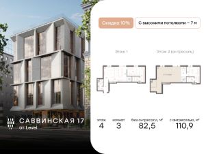 В историческом районе Хамовники продается 3-к квартира площадью 110.40 кв.м, расположенная на 4 этаже клубного дома Саввинская 17 от Level.Преимущества:- всего 22 квартиры редкого формата, что формирует атмосферу элитного закрытого клуба,- высота потолков от 6,43 до 7 метров,- окна в пол, каждая квартира будет наполнена светом и солнцем,- возможность сделать второй уровень в каждой квартире и возможность установить дровяной камин в квартирах на 4-ом этаже,- механизированный подземный паркинг,- закрытый двор с детской площадкой, сенсорным садом для детей и местом для тихого отдыха взрослых.Расположение и инфраструктура:Проект расположен в самом сердце Москвы на Саввинской набережной. - 2 минуты до Садового кольца и 6 минут до ТТК на машине,- 20 минут пешком до станции метро ''Спортивная'',- 15 минут пешком до ''Лужники'',- в окружении более 15 детских садов, в том числе 9 частных,- в пешей доступности расположены 11 школ, 4 из которых входят в топ-20 школ Москвы по версии Forbes,- в окружении 5 парков, в том числе парк ''Новодевичьи пруды'', усадьба Трубецких, парк Горького.Отличная транспортная доступность:Еще одно преимущество резиденции - удобная транспортная доступность. Несмотря на близость к центру, дорога на автомобиле до Садового кольца займет 2 минуты, до ТТК - 6 минут. В пешей доступности (20-24 минуты пешком) находятся три станции метро: ''Спортивная'', ''Фрунзенская'' и МЦК ''Лужники''.