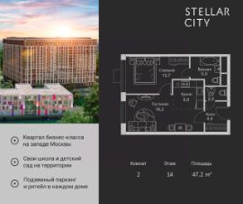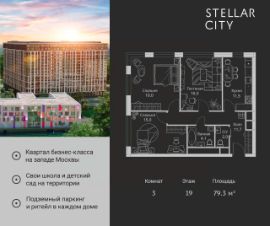 Продается квартира от надежного застройщика Tashir Estate в квартале бизнес-класса Stellar City в ЗАО Москвы. Площадь квартиры составляет: 100.5 кв. м, потолки: 3.1 м Квартира находится на 15 этаже, 4 корпуса жилого квартала Stellar City — микрогорода будущего на орбите Москвы. Stellar City — квартал в ЗАО Москвы вблизи инновационного центра Сколково. В окружении — 11 парков и природных зон, в том числе Долина реки Сетунь, Мещерский лес и парк развлечений The Rink. Город в городе Чтобы дом и инфраструктура вокруг отвечала динамичному лайфстайлу жителя мегаполиса, в основу проекта легла концепция город в городе, которая позволяет решать все бытовые вопросы in-home. В квартале будут возведены школа и детский сад, воркаут-зоны, променад, вело и беговые дорожки, детские площадки для каждого корпуса, а также коммерция на первых этажах для ежедневных покупок. Все необходимое — на расстоянии нескольких шагов. Изящные и лаконичные лобби Авторский дизайн, натуральные материалы в отделке и безупречный интерьер вне времени. Лобби и холлы в проекте бизнес-класса Stellar City ничем не отличаются от входных групп в премиум-сегменте благодаря качественным европейским материалам в отделке, стильному дизайну, консьерж-сервису и уютной зоне ожидания с журнальными столиками и мягкой мебелью. Комфорт и безопасность Закрытая территория, охрана, система СКУД, специально разработанное мобильное приложение дома для резидентов и подземный паркинг с круглосуточным наблюдением и доступом с помощью автоматического считывания номера авто.
