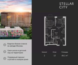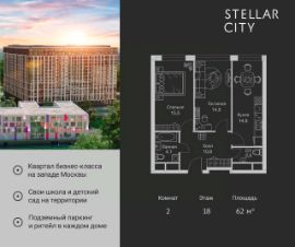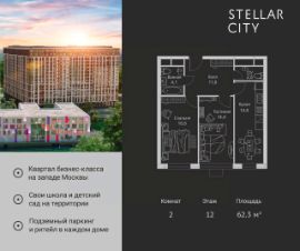 Продается квартира от надежного застройщика Tashir Estate в квартале бизнес-класса Stellar City в ЗАО Москвы. Площадь квартиры составляет: 62 кв. м, потолки: 3.1 м Квартира находится на 18 этаже, 4 корпуса жилого квартала Stellar City — микрогорода будущего на орбите Москвы. Stellar City — квартал в ЗАО Москвы вблизи инновационного центра Сколково. В окружении — 11 парков и природных зон, в том числе Долина реки Сетунь, Мещерский лес и парк развлечений The Rink. Город в городе Чтобы дом и инфраструктура вокруг отвечала динамичному лайфстайлу жителя мегаполиса, в основу проекта легла концепция город в городе, которая позволяет решать все бытовые вопросы in-home. В квартале будут возведены школа и детский сад, воркаут-зоны, променад, вело и беговые дорожки, детские площадки для каждого корпуса, а также коммерция на первых этажах для ежедневных покупок. Все необходимое — на расстоянии нескольких шагов. Изящные и лаконичные лобби Авторский дизайн, натуральные материалы в отделке и безупречный интерьер вне времени. Лобби и холлы в проекте бизнес-класса Stellar City ничем не отличаются от входных групп в премиум-сегменте благодаря качественным европейским материалам в отделке, стильному дизайну, консьерж-сервису и уютной зоне ожидания с журнальными столиками и мягкой мебелью. Комфорт и безопасность Закрытая территория, охрана, система СКУД, специально разработанное мобильное приложение дома для резидентов и подземный паркинг с круглосуточным наблюдением и доступом с помощью автоматического считывания номера авто.
