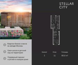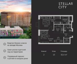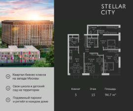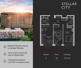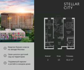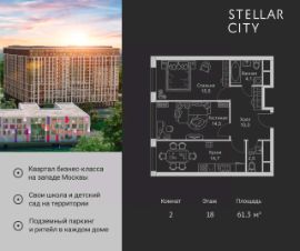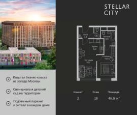 Продается квартира от надежного застройщика Tashir Estate в квартале бизнес-класса Stellar City в ЗАО Москвы. Площадь квартиры составляет: 46.8 кв. м, потолки: 3.1 м Квартира находится на 18 этаже, 4 корпуса жилого квартала Stellar City — микрогорода будущего на орбите Москвы. Stellar City — квартал в ЗАО Москвы вблизи инновационного центра Сколково. В окружении — 11 парков и природных зон, в том числе Долина реки Сетунь, Мещерский лес и парк развлечений The Rink. Город в городе Чтобы дом и инфраструктура вокруг отвечала динамичному лайфстайлу жителя мегаполиса, в основу проекта легла концепция город в городе, которая позволяет решать все бытовые вопросы in-home. В квартале будут возведены школа и детский сад, воркаут-зоны, променад, вело и беговые дорожки, детские площадки для каждого корпуса, а также коммерция на первых этажах для ежедневных покупок. Все необходимое — на расстоянии нескольких шагов. Изящные и лаконичные лобби Авторский дизайн, натуральные материалы в отделке и безупречный интерьер вне времени. Лобби и холлы в проекте бизнес-класса Stellar City ничем не отличаются от входных групп в премиум-сегменте благодаря качественным европейским материалам в отделке, стильному дизайну, консьерж-сервису и уютной зоне ожидания с журнальными столиками и мягкой мебелью. Комфорт и безопасность Закрытая территория, охрана, система СКУД, специально разработанное мобильное приложение дома для резидентов и подземный паркинг с круглосуточным наблюдением и доступом с помощью автоматического считывания номера авто.