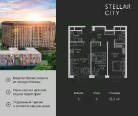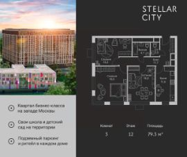 Продается квартира от надежного застройщика Tashir Estate в квартале бизнес-класса Stellar City в ЗАО Москвы. Площадь квартиры составляет: 47.2 кв. м, потолки: 3.1 м Квартира находится на 12 этаже, 4 корпуса жилого квартала Stellar City — микрогорода будущего на орбите Москвы. Stellar City — квартал в ЗАО Москвы вблизи инновационного центра Сколково. В окружении — 11 парков и природных зон, в том числе Долина реки Сетунь, Мещерский лес и парк развлечений The Rink. Город в городе Чтобы дом и инфраструктура вокруг отвечала динамичному лайфстайлу жителя мегаполиса, в основу проекта легла концепция город в городе, которая позволяет решать все бытовые вопросы in-home. В квартале будут возведены школа и детский сад, воркаут-зоны, променад, вело и беговые дорожки, детские площадки для каждого корпуса, а также коммерция на первых этажах для ежедневных покупок. Все необходимое — на расстоянии нескольких шагов. Изящные и лаконичные лобби Авторский дизайн, натуральные материалы в отделке и безупречный интерьер вне времени. Лобби и холлы в проекте бизнес-класса Stellar City ничем не отличаются от входных групп в премиум-сегменте благодаря качественным европейским материалам в отделке, стильному дизайну, консьерж-сервису и уютной зоне ожидания с журнальными столиками и мягкой мебелью. Комфорт и безопасность Закрытая территория, охрана, система СКУД, специально разработанное мобильное приложение дома для резидентов и подземный паркинг с круглосуточным наблюдением и доступом с помощью автоматического считывания номера авто.