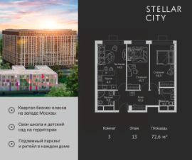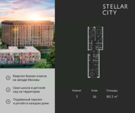 Продается квартира от надежного застройщика Tashir Estate в квартале бизнес-класса Stellar City в ЗАО Москвы. Площадь квартиры составляет: 80.3 кв. м, потолки: 3.1 м Квартира находится на 16 этаже, 4 корпуса жилого квартала Stellar City — микрогорода будущего на орбите Москвы. Stellar City — квартал в ЗАО Москвы вблизи инновационного центра Сколково. В окружении — 11 парков и природных зон, в том числе Долина реки Сетунь, Мещерский лес и парк развлечений The Rink. Город в городе Чтобы дом и инфраструктура вокруг отвечала динамичному лайфстайлу жителя мегаполиса, в основу проекта легла концепция город в городе, которая позволяет решать все бытовые вопросы in-home. В квартале будут возведены школа и детский сад, воркаут-зоны, променад, вело и беговые дорожки, детские площадки для каждого корпуса, а также коммерция на первых этажах для ежедневных покупок. Все необходимое — на расстоянии нескольких шагов. Изящные и лаконичные лобби Авторский дизайн, натуральные материалы в отделке и безупречный интерьер вне времени. Лобби и холлы в проекте бизнес-класса Stellar City ничем не отличаются от входных групп в премиум-сегменте благодаря качественным европейским материалам в отделке, стильному дизайну, консьерж-сервису и уютной зоне ожидания с журнальными столиками и мягкой мебелью. Комфорт и безопасность Закрытая территория, охрана, система СКУД, специально разработанное мобильное приложение дома для резидентов и подземный паркинг с круглосуточным наблюдением и доступом с помощью автоматического считывания номера авто.