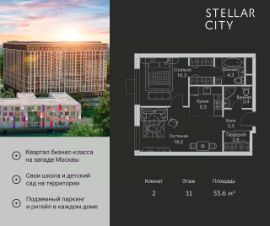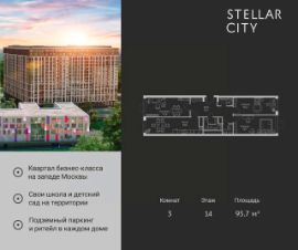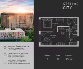 Продается квартира от надежного застройщика Tashir Estate в квартале бизнес-класса Stellar City в ЗАО Москвы. Площадь квартиры составляет: 62.3 кв. м, потолки: 3.1 м Квартира находится на 19 этаже, 4 корпуса жилого квартала Stellar City — микрогорода будущего на орбите Москвы. Stellar City — квартал в ЗАО Москвы вблизи инновационного центра Сколково. В окружении — 11 парков и природных зон, в том числе Долина реки Сетунь, Мещерский лес и парк развлечений The Rink. Город в городе Чтобы дом и инфраструктура вокруг отвечала динамичному лайфстайлу жителя мегаполиса, в основу проекта легла концепция город в городе, которая позволяет решать все бытовые вопросы in-home. В квартале будут возведены школа и детский сад, воркаут-зоны, променад, вело и беговые дорожки, детские площадки для каждого корпуса, а также коммерция на первых этажах для ежедневных покупок. Все необходимое — на расстоянии нескольких шагов. Изящные и лаконичные лобби Авторский дизайн, натуральные материалы в отделке и безупречный интерьер вне времени. Лобби и холлы в проекте бизнес-класса Stellar City ничем не отличаются от входных групп в премиум-сегменте благодаря качественным европейским материалам в отделке, стильному дизайну, консьерж-сервису и уютной зоне ожидания с журнальными столиками и мягкой мебелью. Комфорт и безопасность Закрытая территория, охрана, система СКУД, специально разработанное мобильное приложение дома для резидентов и подземный паркинг с круглосуточным наблюдением и доступом с помощью автоматического считывания номера авто.
