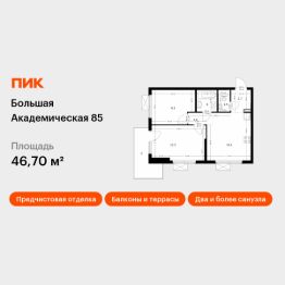 Продаётся 2-комн. квартира площадью 46,7 кв.м на 10 этаже 24 этажного дома (Корпус 3.4, Секция 7) проекта ПИК Большая Академическая 85. Светлый просторный подъезд на уровне земли, функциональная планировка, большие окна, предчистовая отделка. ''Большая Академическая 85'' возводится в Тимирязевском районе — одном из самых тихих и зелёных мест в Москве. От домов до метро ''Окружная'' — 15 минут пешком, а до станции МЦК ''Лихоборы'' — 11 минут. Рядом с ''Большой Академической 85'' есть всё необходимое для комфортной жизни: поблизости работают семь детских садов, шесть школ, три вуза и два торговых центра. Вокруг много парков, в которых приятно гулять и отдыхать. В жилой квартал входят одиннадцать корпусов, в которых есть квартиры и апартаменты. Переменная высота домов — от 11 до 24 этажей — создаёт ощущение простора и позволяет солнечному свету свободно проникать во дворы и комнаты. Фасады природных цветов украшены разными фактурными элементами, поэтому каждый дом выглядит по-особенному. В домах просторные и светлые подъезды без ступеней и пандусов, с выходами во двор и на улицу. На первых этажах домов — магазины и кафе. Для владельцев автомобилей предусмотрен подземный паркинг, а для самых маленьких жителей — собственный детский сад, который объединён с начальной школой. В зелёных дворах-парках оборудованы современные детские площадки и места для отдыха. Ещё на территории проекта есть Local Play — большое игровое пространство для детей, где будет интересно и малышам, и подросткам. Артикул 887106 (Застройщик ООО ''СПЕЦИАЛИЗИРОВАННЫЙ ЗАСТРОЙЩИК ЛИХОБОРЫ'')