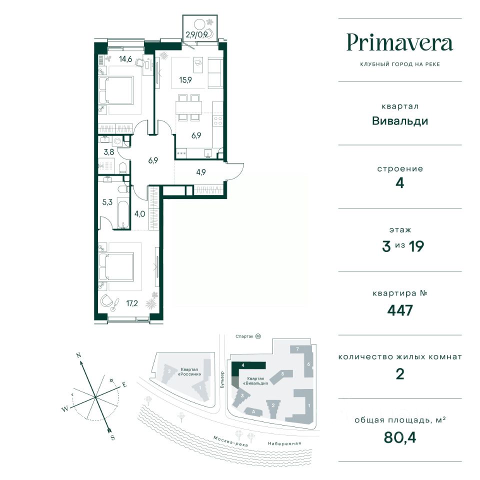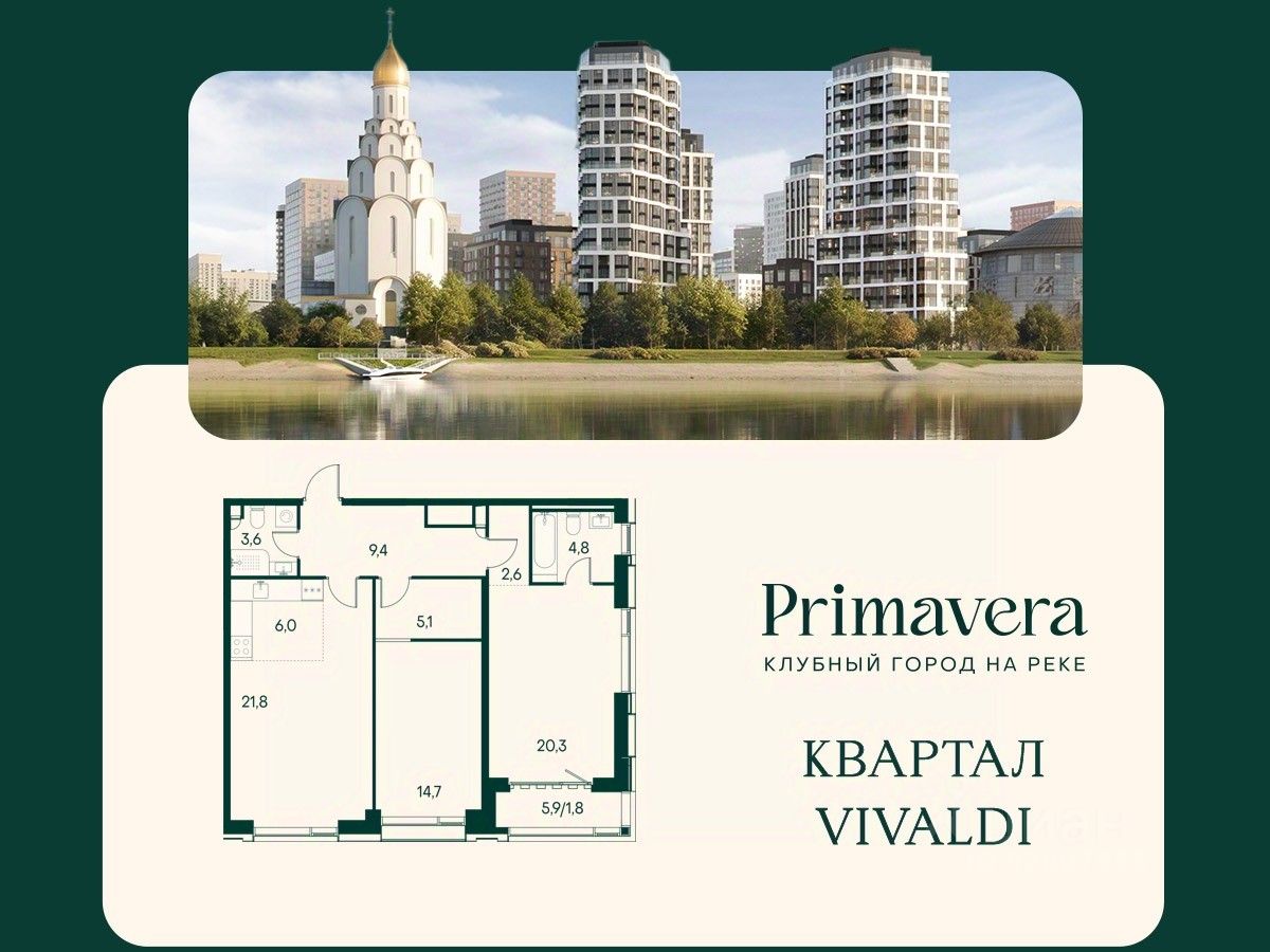 Клубный город на реке Primavera — это современный жилой комплекс премиум-класса, расположенный на первой береговой линии Москвы-реки в экологически чистом районе Покровское-Стрешнево.Под панорамными окнами квартир находится собственный экопарк с продуманной сетью прогулочных дорожек и современными детскими и спортивными площадками. За парком расположена набережная с собственным пляжем и зонами для отдыха.Клубный город на реке Primavera предлагает широкий выбор планировок для различных жизненных сценариев: от просторных однокомнатных квартир до пентхаусов и жилых помещений с террасами и патио. Выберите из 120 вариантов эргономичных планировок стандартного и евроформата.Из каждой квартиры открываются красивые виды на реку с углом обзора в 270 градусов. Дизайнерские лобби предлагают панорамный обзор на благоустроенный двор. Высокие потолки в 6 метров и качественная отделка создают атмосферу, схожую с пятизвездочными отелями.В Primavera есть всё необходимое для комфортной жизни в мегаполисе:•Образование для детей в шаговой доступности: 4 школы, 8 детских садов и развивающие центры с кружками и секциями.•Удобства на расстоянии приятной прогулки: супермаркеты, кафе, рестораны с верандами, салоны красоты, аптеки и многофункциональный центр для шоппинга и развлечений.•Умный дом: автоматизированное бесконтактное управление основными системами доступа и безопасности через мобильное приложение.Клубный город на реке Primavera выгодно сочетает комфорт городской жизни с близостью к природе. Живите в месте, где все создано для вашего удобства!