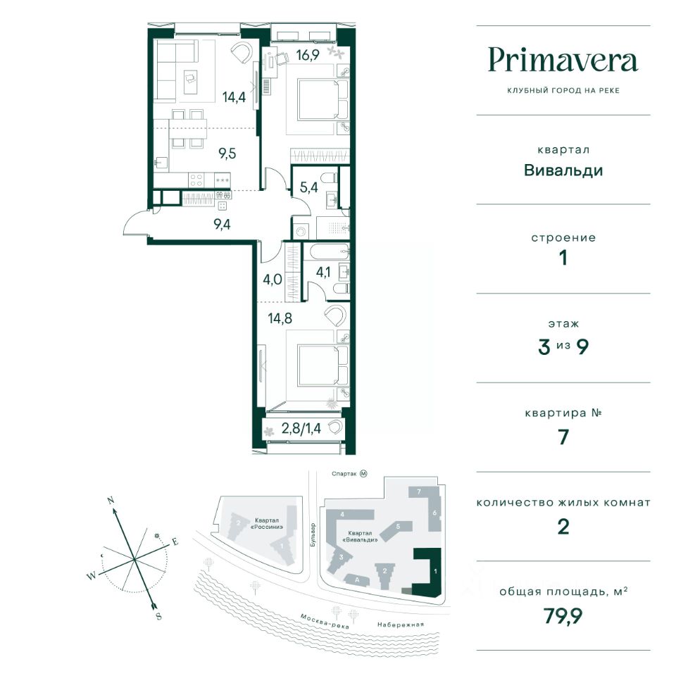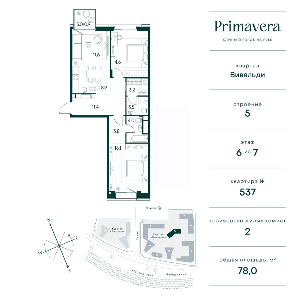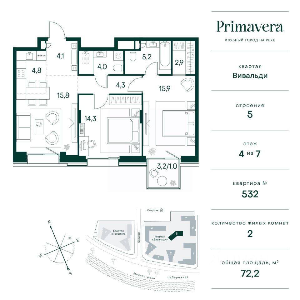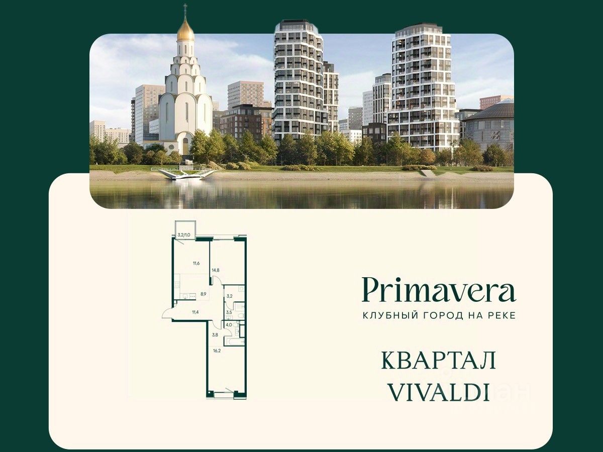 Клубный город на реке ''Примавера'' — это современный жилой комплекс премиум-класса, расположенный на первой береговой линии Москвы-реки в экологически чистом районе Покровское-Стрешнево.Под панорамными окнами квартир находится собственный экопарк с продуманной сетью прогулочных дорожек и современными детскими и спортивными площадками. За парком расположена набережная с собственным пляжем и зонами для отдыха.Клубный город на реке ''Примавера'' предлагает широкий выбор планировок для различных жизненных сценариев: от просторных однокомнатных квартир до пентхаусов и жилых помещений с террасами и патио. Выберите из 120 вариантов эргономичных планировок стандартного и евроформата.Из каждой квартиры открываются красивые виды на реку с углом обзора в 270 градусов. Дизайнерские лобби предлагают панорамный обзор на благоустроенный двор. Высокие потолки в 6 метров и качественная отделка создают атмосферу, схожую с пятизвездочными отелями.В ''Примавера'' есть всё необходимое для комфортной жизни в мегаполисе:•Образование для детей в шаговой доступности: 4 школы, 8 детских садов и развивающие центры с кружками и секциями.•Удобства на расстоянии приятной прогулки: супермаркеты, кафе, рестораны с верандами, салоны красоты, аптеки и многофункциональный центр для шоппинга и развлечений.•Умный дом: автоматизированное бесконтактное управление основными системами доступа и безопасности через мобильное приложение.Клубный город на реке ''Примавера'' выгодно сочетает комфорт городской жизни с близостью к природе. Живите в месте, где все создано для вашего удобства!
