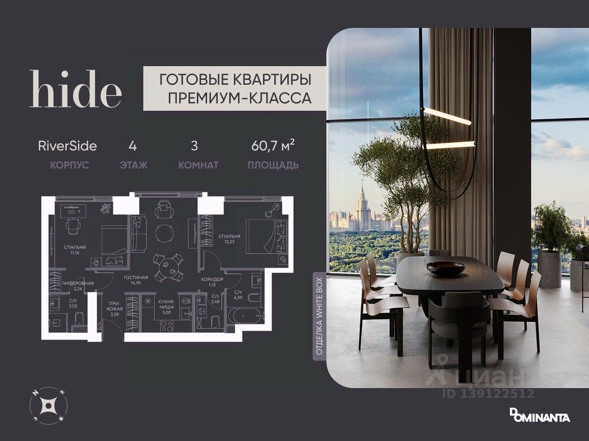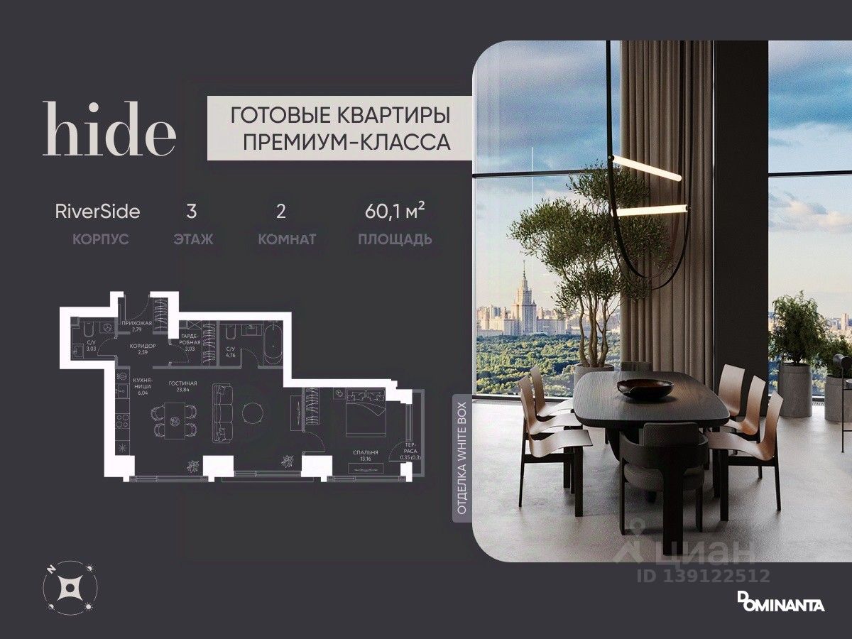 Прямая продажа от застройщика! Дом сдан, ключи в день покупки. Предлагается просторная 2-комнатная квартира 60.1 м² с отделкой white box на 3 этаже в проекте hide — жилом небоскребе премиум-класса от Dominanta и MR. ТОП-ВИДЫ НА 360: Воробьевы горы, Москва-Сити, Лужники, центр, МГУ, Парк Победы. ПРЕСТИЖНАЯ ЛОКАЦИЯ: Расположение на границе районов Раменки и Хамовники: быстро до ТТК, Москва-Сити, а рядом природа — Воробьевы горы и заказники Долины реки Сетунь. КОМФОРТ НОВОГО УРОВНЯ: панорамное остекление, ''Умный дом'', продуманная планировка евроформата. LIFE SPACE ДЛЯ РЕЗИДЕНТОВ: видовая терраса, хоум-офис, фитнес зал, бьюти-кабинет, общественная гостиная. Более 50% двора — ландшафтный парк с холмами и ''парящими'' мостами. СПЕЦИАЛЬНОЕ ПРЕДЛОЖЕНИЕ: скидка 10% при полной оплате и ипотеке без субсидий — действует до 28.02.2026. Не упустите шанс!*Стоимость в объявлении указана со скидкой.
