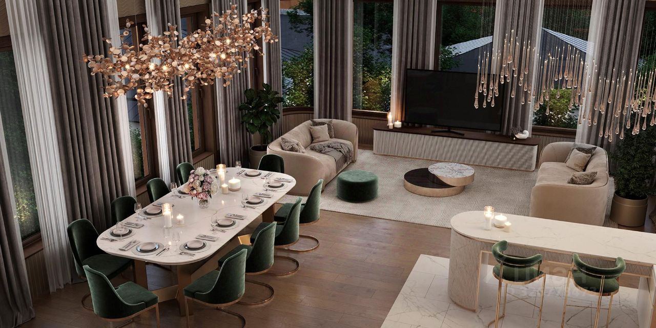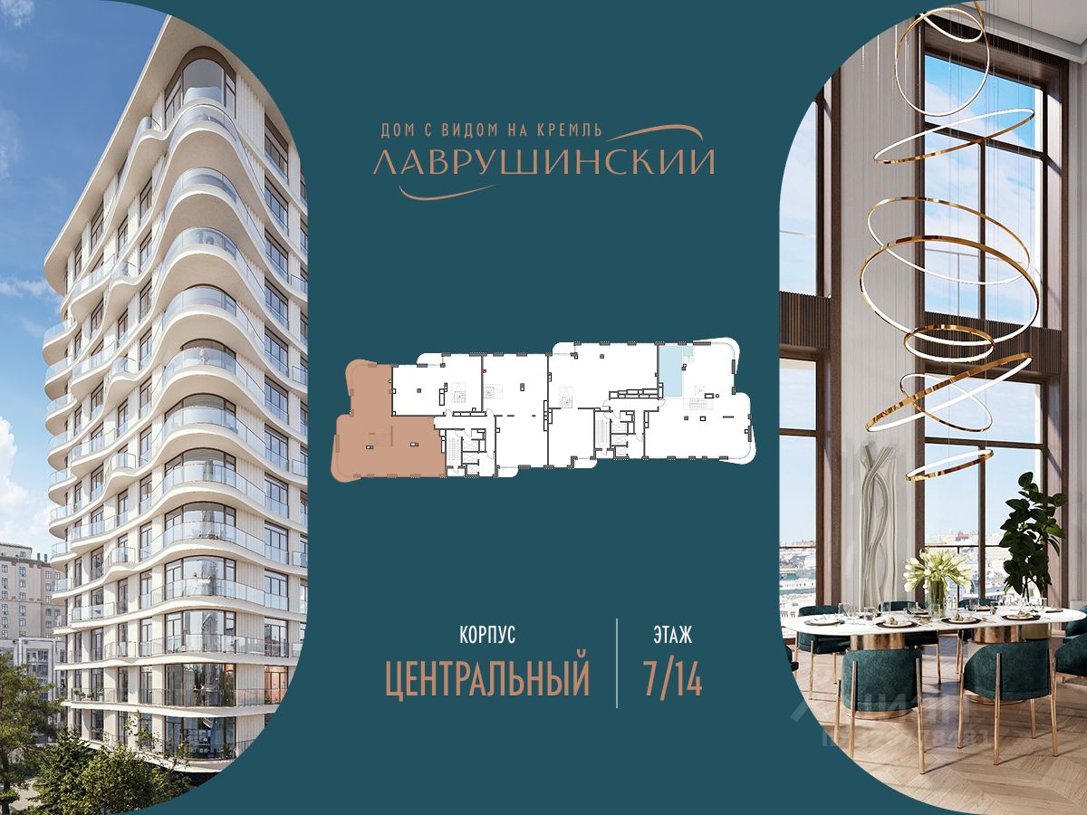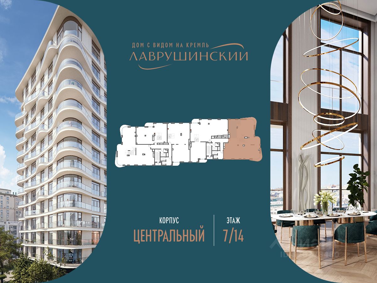 Просторная светлая квартира площадью 470.4 кв. м с окнами на две стороны. В кухне-гостиной (115 кв. м) они выходят на Кремль и исторический цетр Москвы, а панорамное остекление и моллированные окна улучшают видовые характеристики квартиры. Продуманная планировка позволяет разместить семь приватных спальных комнат с отдельными гардеробными и санузлами. ''Лаврушинский'' - бескомпромиссный дом с лучшими видами на Кремль. Благодаря расположению всего в одном километре от Кремля, своей высоте и малоэтажной окружающей застройке, из квартир открываются поразительные прямые виды на главные достопримечательности центра Москвы, включая храм Христа Спасителя и собор Василия Блаженного. Расположение в глубине квартала, посередине парка, дает удивительное для центра ощущение тишины и простора. На закрытой территории находится самый большой на элитном рынке собственный ландшафтный парк площадью 1,4 га с фонтаном, ручьём, зонами для воркаута и тихого отдыха. KIDS LAB: развивающая детская площадка на улице и игровая комната в помещении. FIT LAB: фитнес-клуб с 25-метровым бассейном, beauty room, доступные только для жителей. В проекте уникальный выбор квартир с просторными балконами, пентхаусов с террасами, бассейнами и каминами, максимальными видовыми характеристиками, а также роскошных вилл. Всего - 153 квартиры и 101 продуманное планировочное решение. Высота потолков составляет от 3,5 до 8,25 м. В доме предусмотрен 2х-уровневый паркинг на 279 машино-места. В доме предусмотрен полный комплекс систем комфорта, включающий приточно-вытяжную вентиляцию с тонкой фильтрацией с принципом забора воздуха с высоты 50 метров для повышения продолжительности жизни, отдельный сервисный лифт для обслуживающего персонала и другие современные системы.