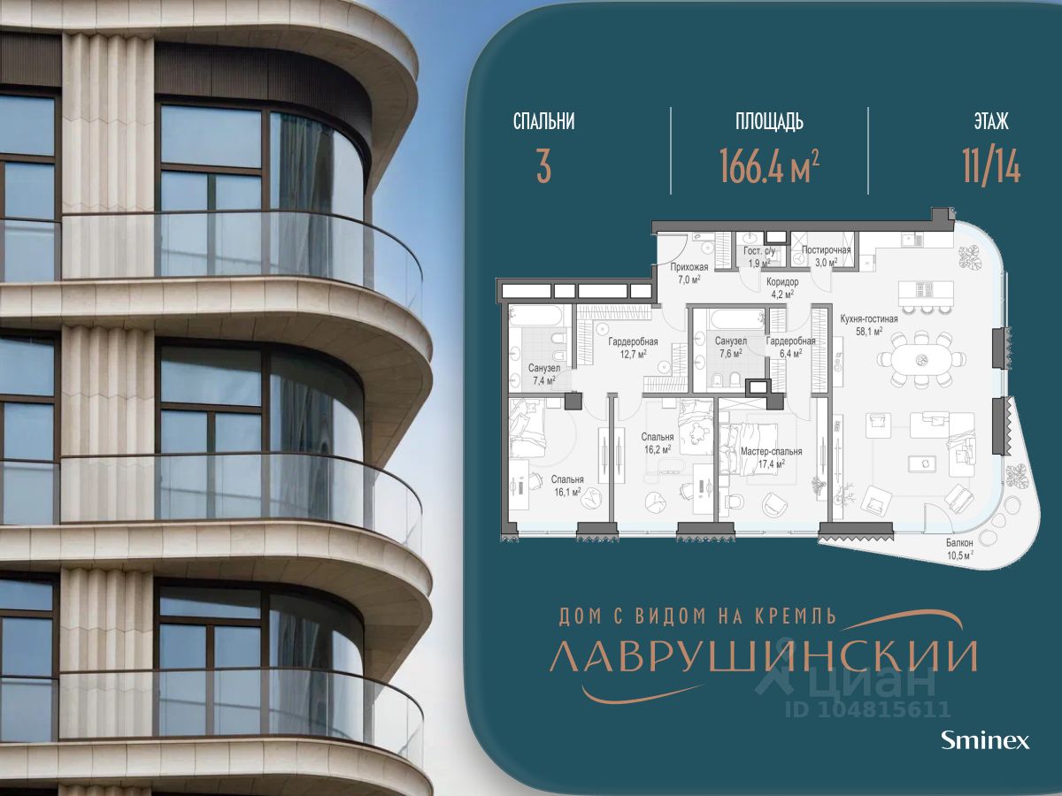 Просторная светлая квартира площадью 166.4 кв. м. Окна кухни-гостиной обращены в сторону Кремля и выходят в тихий Пыжёвский переулок, а панорамное остекление, моллированное окно и открытый балкон улучшают видовые характеристики квартиры. Продуманная планировка позволяет разместить три спальные комнаты с отдельными санузлами и гардеробными. Окна квартиры выходят на восточную и южную стороны. ''Лаврушинский'' - бескомпромиссный дом с лучшими видами на Кремль. Благодаря расположению всего в одном километре от Кремля, своей высоте и малоэтажной окружающей застройке, из квартир открываются поразительные прямые виды на главные достопримечательности центра Москвы, включая храм Христа Спасителя и собор Василия Блаженного. Расположение в глубине квартала, посередине парка, дает удивительное для центра ощущение тишины и простора. На закрытой территории находится самый большой на элитном рынке собственный ландшафтный парк площадью 1,4 га с фонтаном, ручьём, зонами для воркаута и тихого отдыха. KIDS LAB: развивающая детская площадка на улице и игровая комната в помещении. FIT LAB: фитнес-клуб с 25-метровым бассейном, beauty room, доступные только для жителей. В проекте уникальный выбор квартир с просторными балконами, пентхаусов с террасами, бассейнами и каминами, максимальными видовыми характеристиками, а также роскошных вилл. Всего - 153 квартиры и 101 продуманное планировочное решение. Высота потолков составляет от 3,5 до 8,25 м. В доме предусмотрен 2х-уровневый паркинг на 279 машино-места. В доме предусмотрен полный комплекс систем комфорта, включающий приточно-вытяжную вентиляцию с тонкой фильтрацией с принципом забора воздуха с высоты 50 метров для повышения продолжительности жизни, отдельный сервисный лифт для обслуживающего персонала и другие современные системы.