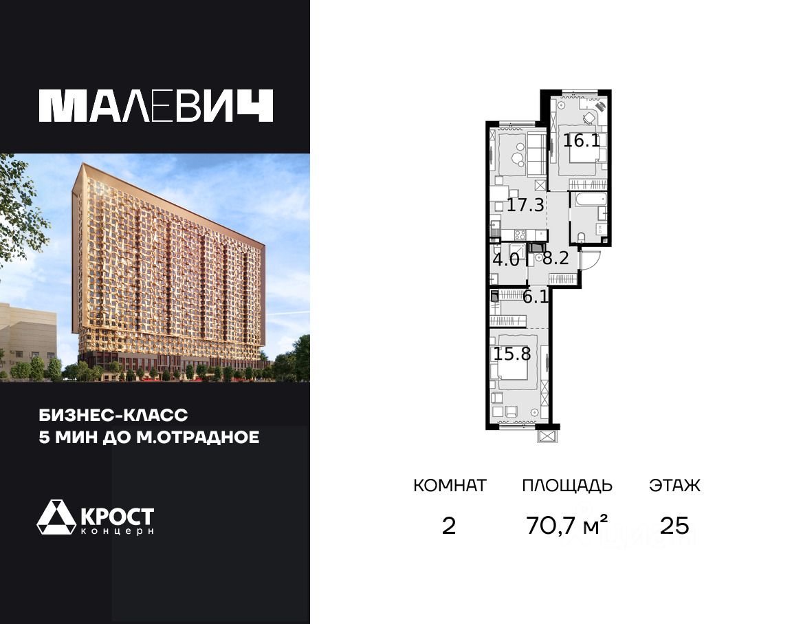 Продаётся 2-к квартира 70.7 кв.м. на 24-м этаже 28 этажного дома. Без отделки. Срок сдачи: 1 кв. 2026 г. Дом MALEVICH - это идеальный проект мультифункционального жилого дома, в котором все элементы общественных и личных пространств тщательно продуманы и спроектированы. Здание состоит из двух объемов, один из которых сдвинут относительного другого в горизонтальной плоскости. Авторы идеи придумали совмещать различные слои и цвета бетонов в одной плоскости и рисовать картины не кистью и красками, а различными рецептами бетонов. Картины украсят полы, стены и потолки входных групп, подземного паркинга, мест общего пользования. В Доме MALEVICH не один, а сразу 2 парковых общественных пространства, каждое из которых обладает собственной функцией: - внутренний двор только для жителей во внутренней части здания, - открытый парк-вернисаж на ул. Отрадная, доступный для внешних посетителей. Проект дома расширяет возможности вашей квартиры, предоставляя дополнительное пространство для работы, отдыха, учебы, дружеского общения и воспитания детей.Прямая продажа от застройщика ООО СЗ ''Аквапарк ''Отрадное ''.