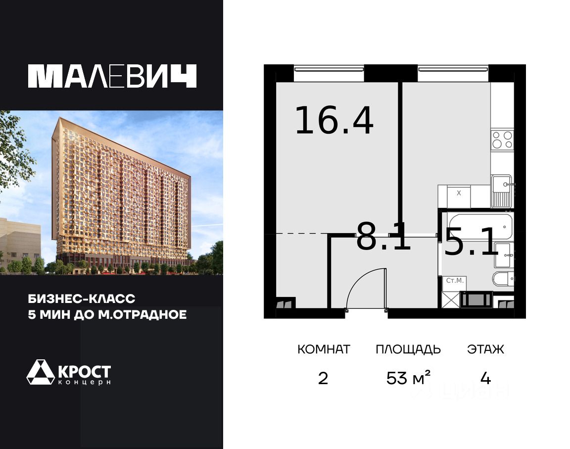 Продаётся 2-к апартаменты 53 кв.м. на 4-м этаже 28 этажного дома. Без отделки. Срок сдачи: 1 кв. 2026 г. Дом MALEVICH - это идеальный проект мультифункционального жилого дома, в котором все элементы общественных и личных пространств тщательно продуманы и спроектированы. Здание состоит из двух объемов, один из которых сдвинут относительного другого в горизонтальной плоскости. Авторы идеи придумали совмещать различные слои и цвета бетонов в одной плоскости и рисовать картины не кистью и красками, а различными рецептами бетонов. Картины украсят полы, стены и потолки входных групп, подземного паркинга, мест общего пользования. В Доме MALEVICH не один, а сразу 2 парковых общественных пространства, каждое из которых обладает собственной функцией: - внутренний двор только для жителей во внутренней части здания, - открытый парк-вернисаж на ул. Отрадная, доступный для внешних посетителей. Проект дома расширяет возможности вашей квартиры, предоставляя дополнительное пространство для работы, отдыха, учебы, дружеского общения и воспитания детей.Прямая продажа от застройщика ООО СЗ ''Аквапарк ''Отрадное ''.