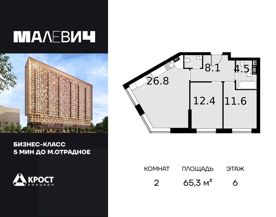 Продаётся 2-к апартаменты 65.3 кв.м. на 6-м этаже 28 этажного дома. Без отделки. Срок сдачи: 1 кв. 2026 г. Дом MALEVICH - это идеальный проект мультифункционального жилого дома, в котором все элементы общественных и личных пространств тщательно продуманы и спроектированы. Здание состоит из двух объемов, один из которых сдвинут относительного другого в горизонтальной плоскости. Авторы идеи придумали совмещать различные слои и цвета бетонов в одной плоскости и рисовать картины не кистью и красками, а различными рецептами бетонов. Картины украсят полы, стены и потолки входных групп, подземного паркинга, мест общего пользования. В Доме MALEVICH не один, а сразу 2 парковых общественных пространства, каждое из которых обладает собственной функцией: - внутренний двор только для жителей во внутренней части здания, - открытый парк-вернисаж на ул. Отрадная, доступный для внешних посетителей. Проект дома расширяет возможности вашей квартиры, предоставляя дополнительное пространство для работы, отдыха, учебы, дружеского общения и воспитания детей.Прямая продажа от застройщика ООО СЗ ''Аквапарк ''Отрадное ''.