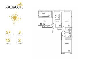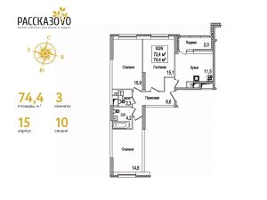 Продается 3-комнатная квартира в ЖК Рассказово на 15 этаже. Общая площадь квартиры составляет 74,4 кв.м. Квартира без отделки.Уникальность комплекса в его архитектуре все дома построены в стиле Москвы 30-х годов, создавая неповторимое ощущение присутствия романтики того времени.Роскошные входные группы, отделанные мрамором, с высотой потолков 4,5 м, белыми лепными карнизами и стойкой ресепшн с авторской отделкой создают атмосферу уюта, полностью отражая дух и воплощение уникальной архитектурной концепции 30-40 годов, являясь ее логическим продолжением.Преимущество локации заключается в благоприятной экологической обстановке с трех сторон комплекс окружен Ульяновским лесопарком и отсутствием промышленных предприятий, обеспечивая жителей чистым воздухом. До ближайшей станции метро ''Рассказовка'' всего 850 метров, а до центра можно доехать за 30 минут.Проект предполагает комплексное освоение территории, создание комфортной жилой застройки с развитой качественной инфраструктурой:- большое количество парковочных мест предусмотрены как закрытые подземные паркинги, так и крытые наземные парковки с дополнительно выделенными открытыми парковочными местами возле домов,- круглосуточно охраняемая территория, закрытая от посторонних для безопасности каждого жителя,- двор-парк без машин, где можно не переживать за играющих детей,- социальные объекты: своя поликлиника, детские сады и школы,- здоровая среда: воркаут - площадки, обустроенные места для занятий спортом на свежем воздухе, живописные места для утренних пробежек, велосипедные маршруты любой сложности,- благоустроенная набережная лесного озера для тихих прогулок или семейного отдыха,- коммерческие объекты действующие магазины, кафе и салоны красоты.Узнайте больше о комплексе приезжайте на просмотр, записавшись по телефону. Менеджер вас встретит, угостит вкусным кофе, проведет по территории и покажет квартиру.