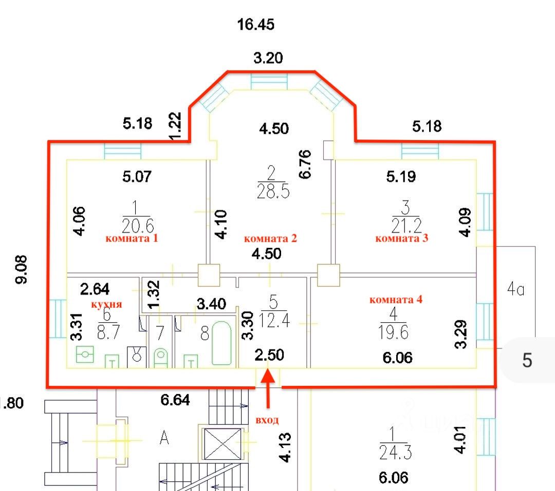 Продаётся 4-х комнатная квартира общей площадью 116,7 кв.м. Гостиная с эркером 28,5 кв.м. и три изолированные комнаты площадью 20,6 / 21,2 / 19,6 кв.м. Кухня 8,7 кв.м. Просторная прихожая Окна квартиры выходят на три стороны в тихий внутренний двор! Один взрослый собственник Без обременений Свободная продажа