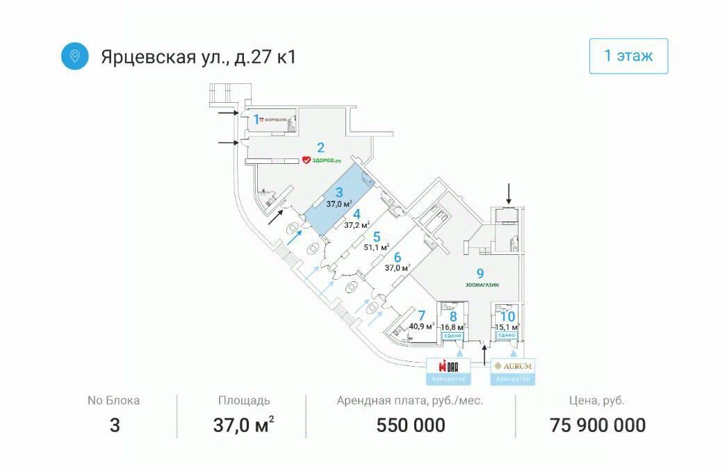 СОБСТВЕННИКИ! Предлагается к продаже торговое помещение площадью 527,8 м2 с арендатором - даркстор Ozon (ДДА на 5 лет), расположенное на 1 этаже. Объект находится в прямой видимости от выхода из метро Воронцовская. МАП - 1,5 млн.руб. (с 01.02.26 г.), ежегодная индексация - 10%. Характеристики помещения: - отдельный вход, - свободная планировка, - высота потолков 3 м, - большие окна по периметру здания, - зона погрузки/разгрузки, - центральные коммуникации, - две мокрых точки, - круглосуточно охраняемая территория с пропускной системой, - парковка перед зданием. Номер объекта: #1/536969/21663