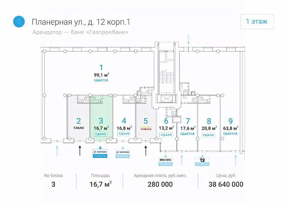 Лот: 38433. Помещение свободного назначения формата Street Retail в СЗАО Москвы. Шаговая доступность от ст. метро ''Планерная'' — 1 минута пешком. Отличная пешеходная и транспортная доступность. Помещение расположено в крупном сложившемся жилом районе с высокой плотностью застройки и развитой инфраструктурой. Арендатор: Газпромбанк. МАП: 280 000 руб.