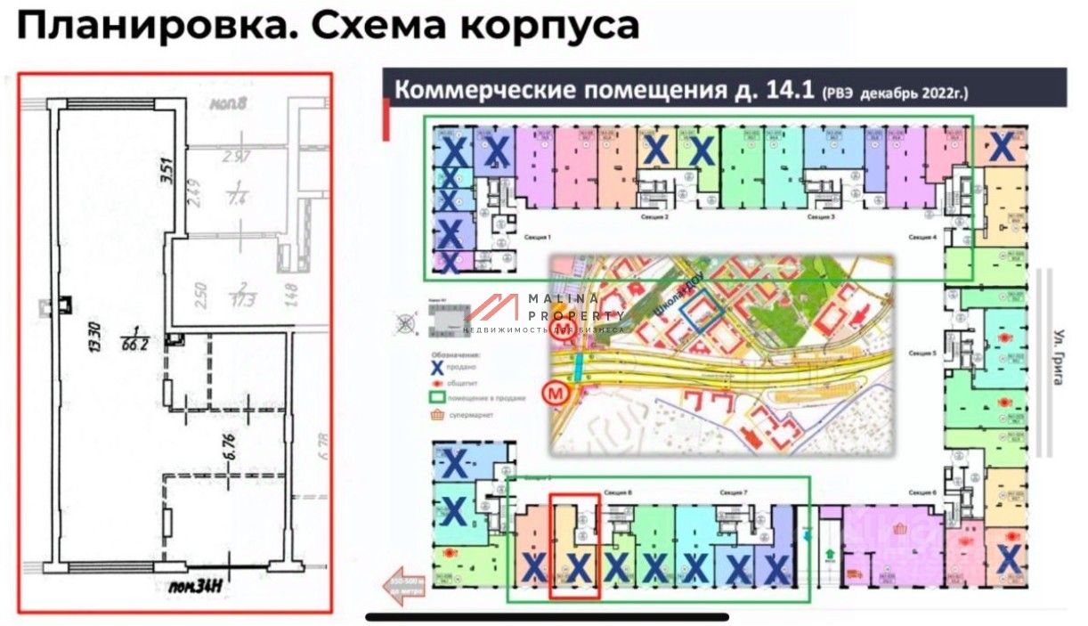 Лот 152947. Продажа помещения с сетевым арендатором. Действующий бизнес супермаркет ''Дикси''. Располагается в СЗАО Москвы, в Новом ЖК ''Движение. Тушино''. Это 3 корпуса переменной этажности с общим количеством апартаментов 1407 шт. и населением 1800 человек. Все корпуса введены в эксплуатацию. Рядом находятся две станции метро - ''Спартак'' и ''Тушинская'', остановка общественного транспорта, а так же в 10 минутах ходьбы - ж/д станция ''Тушино'' и междугородная автостанция ''Тушинская''. Технические характеристики: Площадь помещения 873,6 кв.м (из них арендуемая супермаркетом площадь 576 кв.м.). Встроенно-пристроенное помещение, 3 отдельных входа. Выделенная мощность 160 кВт. Загрузка внутри. Парковка перед помещением на 29 м/м. Арендаторы: Арендатор 1 супермаркет Дикси, S=576 кв.м. Срок аренды: 10 лет. Плата за коммунальные услуги - отдельно. МАП (1 год аренды) 1 месяц: 846 000,00 руб. Ставка аренды 2-ого года 1 440 904,00 руб. Ставка аренды 3-его года 1 728 300,00 руб. ГАП (1 год): 10 152 000 руб. Индексация с 4-ого года (безусловная) 3% Арендатор 2 помещение еще вакантно, S=280 кв.м. получено КП на аренду от сетевого даркстора. Срок окупаемости проекта от средней ставки аренды от сдачи 100% площадей Объекта составит 10 лет, что находится выше средних показателей в 11-13 лет по рынку. Коммерческие условия: Стоимость: 323 282 000 руб. Стоимость кв.м.: 370 057,2 руб. НДС включен.