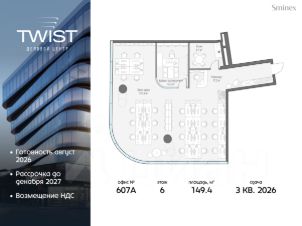 Готовность в августе 2026. Рассрочка до декабря 2027. Видовой офис площадью 149.40 кв. м. с панорамным остеклением ориентирован на Бутырскую улицу. Правильная форма и минимальное количество несущих конструкций позволяют максимально эффективно зонировать пространство. Панорамное остекление обеспечивает максимальное количество естественного освещения в дневное время и динамичный вид на город в вечернее.Деловой центр Twist специально создан для размещения клиентских офисов. Он отличается исключительной транспортной доступностью: расположен прямо у станции метро ''Савёловская'', непосредственно у ТТК.Это прогрессивный деловой центр с безбарьерной системой доступа, которая сделала для клиентов проход к офисам быстрым, простым и комфортным. Новый дружелюбный стандарт безопасности здания освобождает от турникетов и необходимости оформлять пропуск.В Twist создана насыщенная инфраструктура для неформального общения с клиентами. Twist расположен на перекрёстке крупных дорог и виден со всех сторон — здание привлекает взгляды и заметно издалека. В 2023 году Twist получил престижную Архитектурную премию Москвы как лучший деловой центр.Twist небольшой и уютный. В нём всего 56 офисных лотов и девять этажей. В Twist широкий выбор офисов, которые производят впечатление на клиентов: от 50 кв. м до целых этажей разной площади, включая офисы со своими террасами.Премиальный деловой центр обладает самыми прогрессивными и полными системами комфорта. О резидентах и здании заботится Служба комфорта Smineх, которая предлагает сервис уровня 5-звёздочных отелей и сохраняет изначальный облик и концепцию здания.Девелопер проекта — Sminex, перфекционисты Fine Development. Компания обладает 24-летним опытом строительства жилой и коммерческой недвижимости, создаёт комфортную и престижную среду. В 2022 году Sminex приобрёл девелопера ''Интеко'', в 2024 году — Ingrad.