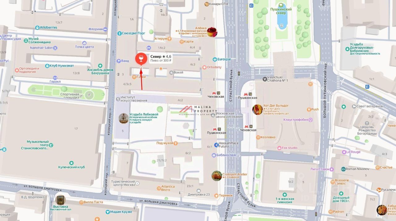 Продажа торгового помещения 212,3 м2 с арендатором на Страстном бульваре, д. 4/3 (2 минуты пешком от метро Пушкинская). Помещение 212,3 м2 располагается на 1 этаже, открытая планировка, отдельный вход, высота потолка 3,4 м, окна по фасаду. Электрическая мощность 60 кВт. Место для размещения рекламы. Большой поток пешеходного и автомобильного трафика, рядом остановка общественного транспорта. Торговое окружение — бары ''Онегин'', ''Бирмаркет'', Dukh, ресторан ''Траттория Венеция''. Арендатор: Бар ''Север'', арендная ставка 1 003 105 рублей. Стоимость продажи 250 000 000 рублей. Без комиссии.