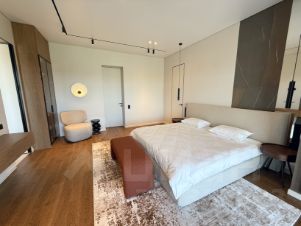Ренессанс Парк. Загородный дом площадью 995 м² построен на просторном полевом участке 17 соток. Фасад здания с панорамными окнами, вдохновленный стилем Фрэнка Ллойда Райта, облицован серым камнем и вертикальной доской, декорирован подсветкой. В отделке современного интерьера использованы шпон, массив дерева и паркетная доска. Мебель и освещение представлены известными итальянскими брендами, установлена сантехника Antonio Lupi. Планировка резиденции включает 5 спален, большую кухню-гостиную, рабочую кухню, кабинет. Предусмотрен гараж на 4 машины, над которым расположена квартира для персонала с 3-мя спальнями, кухней, санузлом и прачечной. На участке выполнен ландшафтный дизайн от компании Imperial Garden, засеян газон и высажены крупномеры.Поэтажное описание1-й уровень: холл, гардеробная, гостиная-кухня, рабочая кухня с санузлом, спальня с гардеробной и санузлом, гостевой санузел, прачечная, кладовая, гардеробная, котельная.2-й уровень: мастер-спальня с 2-мя санузлами и гардеробной, 3 спальни с санузлами и гардеробными, кабинет.Главное о посёлке. В ''Ренессанс Парке'' акцент сделан на приватность и благоустроенную среду: закрытая территория с круглосуточной охраной и контролем доступа позволяет спокойно отпускать детей во двор. По широким освещённым улицам с тротуарами комфортно бегать по утрам и кататься на велосипедах — маршруты продуманы для прогулок без выезда за пределы кварталов. Центральная точка притяжения — парк на берегу озера с аллеями и зонами отдыха: здесь назначают утренние встречи с соседями и гуляют с коляской после ужина. Масштаб посёлка — около 130 гектаров — даёт пространство и воздух, а единая архитектурная среда формирует цельный, ухоженный вид улиц. Для семей, кому важен метраж, представлены дома порядка 4901300 м² и участки 16212 соток — удобно подобрать сценарий жизни от ''городского загородного дома'' до полноценной резиденции. Выезды на Новорижское шоссе занимают считаные минуты, а до МКАД — 19 км, так что рабочие поездки не конфликтуют с тихим форматом жизни у воды и парка. Вечерами район остаётся спокойным: охрана и озеленённые бульвары создают ''клубную'' атмосферу, где легко переключаться между делами и отдыхом.Главное о локации. Утро здесь начинается с короткой поездки по Новой Риге: вы на М9 и уже через пару минут в деловом ритме города, а дома — зелёная тишина деревни Чесноково. Для ежедневных покупок — ''ВкусВилл'' на ул. Ленина, 1 в соседней Павловской Слободе, за крупными закупками и повседневными сервисами удобно заезжать в ТРК ''Павлово Подворье'', где ''Перекрёсток'' работает круглосуточно. Детям — Павловская средняя школа на Комсомольской, 5А и муниципальные детсады, в том числе 42 на Садовой, 1А, дорога занимает несколько минут по локальным улицам. Плавание и секции — в бассейне AquaShark (Академическая, 1), а для релакса и банных дней — оздоровительный комплекс санатория Istra Resort с 25-метровым бассейном, джакузи и сауной. По выходным — ужины в локальных ресторанах Павловской Слободы или быстрый шопинг с кофе в ''Павлово Подворье''. Ландшафт поддерживает здоровый быт: вокруг — лесные массивы, а сама Чесноково лежит у небольшой речки Руденка, притока Беляны, так что вечерние прогулки получаются по-подмосковному спокойными. При этом до Павловской Слободы и ''Павлово Подворья'' — порядка пяти минут на машине, что удобно для еж