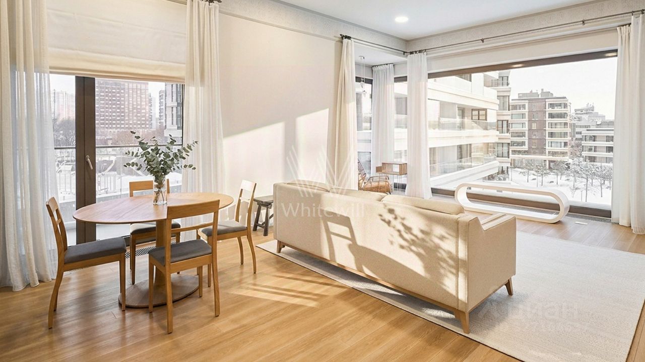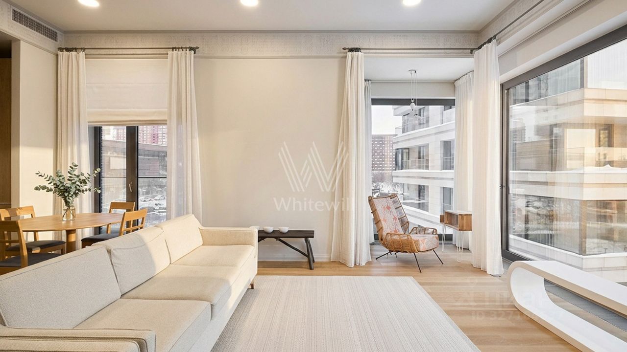 Премиальная квартира площадью 197 м² в современном клубном комплексе ''Снегири Эко'' на берегу Мосфильмовского пруда. Выполнена светлая дизайнерская отделка с использованием ценных пород дерева. Панорамные окна в сочетании с потолками высотой 3,3 метра наполняют пространство светом. Всего 2 квартиры на этаже. Планировка: просторная гостиная с кухней и обеденной зоной, 3 спальни со своими полноценными санузлами, гостевой санузел. Абсолютно с умом использована площадь, ощущается очень просторно. На все стороны спланированы балконы. Из окон открывается вид в в приватный двор-сад, на Парк Победы, ''Москва-Сити''. Предусмотрены 2 машино-места в подземном паркинге и кладовая. Главное о доме. ''Снегири ЭКО'' — делюксовый комплекс из 15 клубных особняков в собственном пятигектарном парке на берегу Мосфильмовского пруда. Архитектуру для проекта разработало британское бюро Bogle Architects: фасады собраны из натурального камня, клинкерного кирпича и стекла. В квартирах предусмотрены панорамные окна на три стороны, террасы и патио, на верхних уровнях — просторные пентхаусы с видами на зелёные массивы и воду. В лобби и холлах использованы камень и дерево, а дворы благоустроены цветниками, беседками и тихими аллеями. В комплексе работают ресторан, фитнес-клуб, spa и детские игровые зоны с фонтанами. Подземный паркинг с лифтами дополняет маршрут до квартиры. Главное о локации. Клубные дома расположены в Раменках, рядом с заказником ''Долина реки Сетунь''. По утрам здесь удобно гулять по экотропам или бегать вдоль пруда, а днём отправиться в парк Победы на Поклонной горе или в Воробьёвы горы — дорога займёт 10 минут на машине. Для семей доступны гимназия 1448, школа 1586 и детский сад 82, а малышей принимают развивающие центры поблизости. В повседневной жизни помогают ''Азбука вкуса'' и ''ВкусВилл'', а для встреч и ужинов в 15 минутах ждут рестораны на Кутузовском проспекте. Метро ''Минская'' находится в 12 минутах пешком, выезд на Ломоносовский и Кутузовский проспекты занимает 10 минут. Комментарий эксперта. Меня зовут Елизавета Никишина — брокер компании Whitewill. Я отвечаю за аренду этого лота. Свяжитесь со мной, чтобы получить расширенную презентацию, больше фотографий или договориться о просмотре. Могу провести экскурсию по локации и познакомить вас с этим домом. ID 1 249.