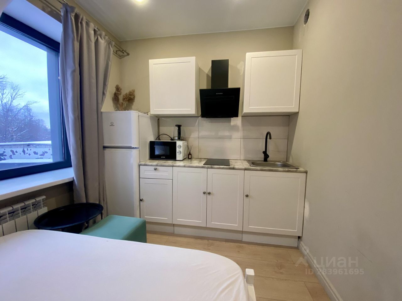 Светлая студия, оборудованная всей необходимой мебелью и техникой: встроенная кухня, микроволновка, стиральная машина, двуспальная кровать, шкаф для хранения вещей (не отображен на фото), комод, широкий подоконник, который можно использовать в качестве рабочего места. Жилой комплекс с закрытой, охраняемой 24/7 территорией, много парковочных мест, на территории жк для жителей есть спорт зал, комната с настольным теннисом и бильярдом, кафе. Все необходимая инфраструктура в пешей доступности, до метро Авиамоторная 12 мин. быстрым шагом.