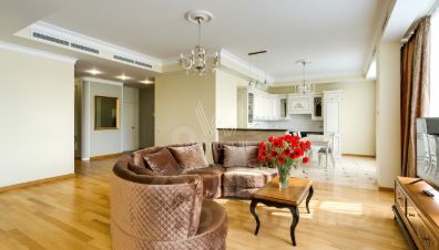 ID 347826 Трехуровневая квартира площадью 380,1 м2 расположена в жилом комплексе Ближняя дача.На первом этаже спланирована гостиная, кухня-столовая, кабинет, гостевой санузел, гардеробная. Второй этаж: 4 спальни, 3 гардеробные, 3 ванные комнаты, балкон.Цокольный этаж: кинозал, хаммам, комната для прислуги, 2 ванные комнаты, постирочная, кладовая. Предусмотрен собственный вход с улицы в квартиру.В квартире выполнен качественный ремонт с использованием натуральных материалов. Все комнаты обставлены и декорированы. На кухне установлена бытовая техника Gaggenau, в ванной комнате сантехника Villeroy&Boch, в постирочной стиральная машина Miele.В стоимость включены два машиноместа в подземном паркингеПредоплата за 1 месяцЗалог 15 000 ₽