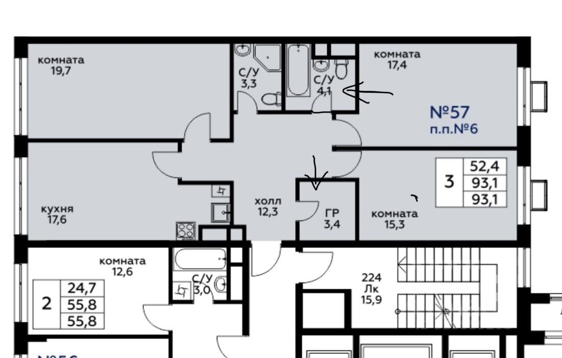 58 м² · Этаж 19 из 23