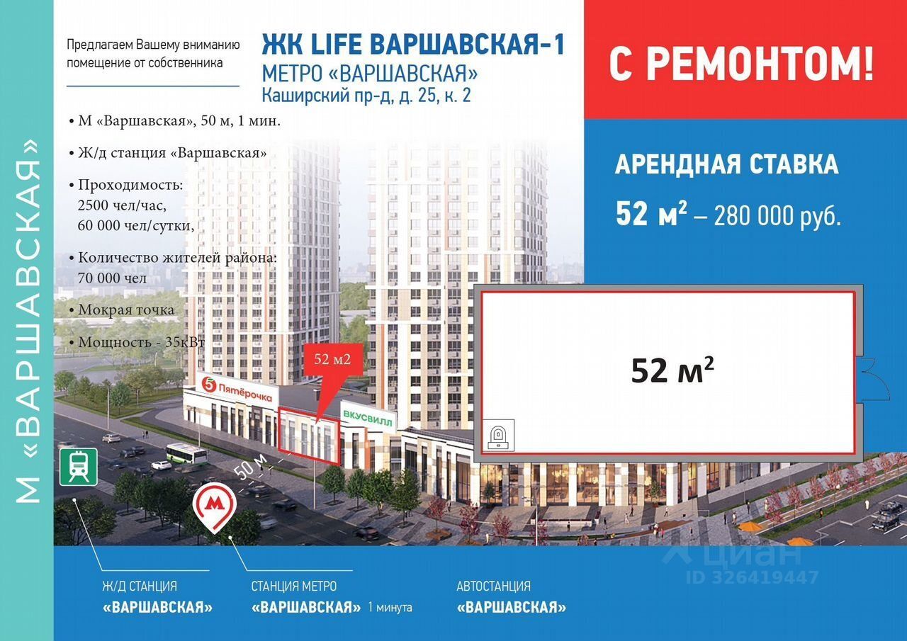 Id 58486. Аренда помещения в ЖК Life Варшавская | Топовая локация, высокий трафик Сдается помещение свободного назначения (street retail) в одном из лучших жилых комплексов Москвы — ЖК Life Варшавская. Преимущества локации: •Прямо у входа в школу (стабильный поток родителей и детей) •Рядом популярные якорные арендаторы: OZON, Wildberries, Винлаб •Высокий пешеходный и автомобильный трафик — окна выходят на улицу. Характеристики помещения: •Панорамные витражные окна (идеально для вывески и рекламы) •Высота потолков 5,6 м — можно сделать мезонин / второй этаж •универсальная планировка •Угловое расположение = максимальная заметность Есть возможность достроить второй этаж до общей площади 70-75 метров Финансовые условия: •Арендные каникулы 2 месяца •Далее аренда: 100 000 ? / мес. (первые 6 месяцев) •Дальше обсуждаемо, гибкие условия Идеально под: кафе, пекарню, салон красоты, студию, шоурум, магазин, аптеку, услуги.