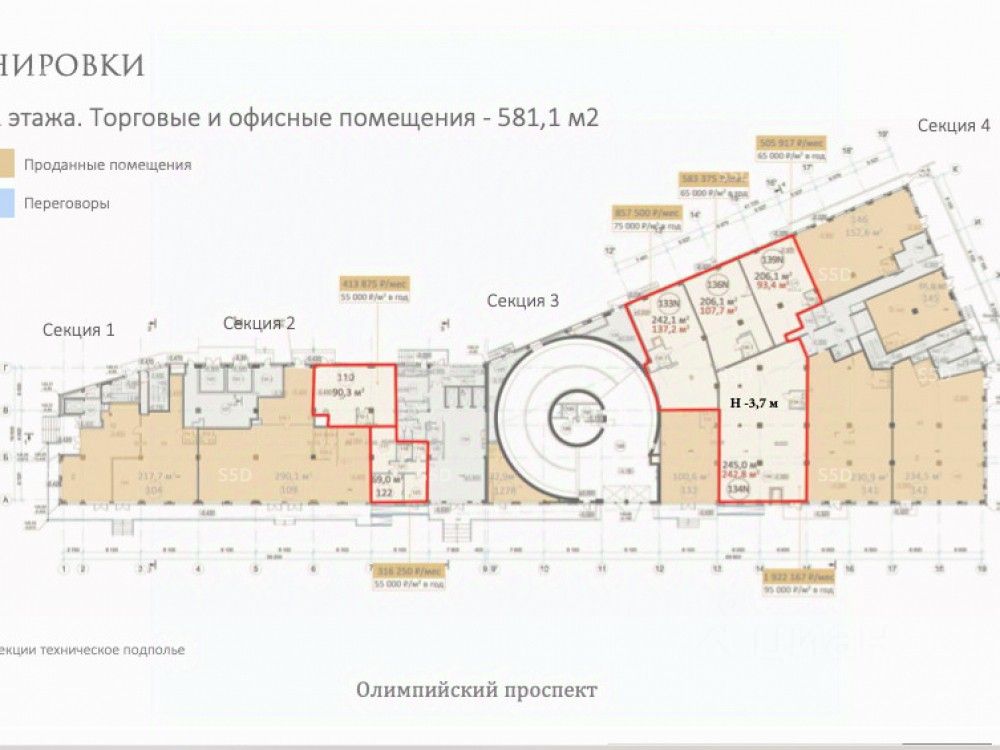 Лот 142006. Предлагается в аренду торговое помещение, расположенное в премиальном в ЖК RED 7. 1-я линия проспекта Академика Сахарова и Садового кольца: удобный выезд на Садовое кольцо. 4 станции метро в пешей доступности. Расположение в офисно-деловом кластере на Садовом. Торговое окружение: в апарт-комплексе будут располагаться рестораны, кафе, супермаркет премиального уровня, торговые помещения. В первичную зону охвата в радиусе 500 м от МФК RED7 попадает 4 жилых квартала, в которых проживает порядка 7 тыс. человек. А также офисно-деловой кластер: бизнес-центры ''Домников'', ''Орликов Плаза'', административное здание на ул. Маши Порываевой и др. Технические характеристики: Помещение общей площадью - 341.4м2, расположено на -1 этаже, имеет зальную планировку, высота потолка - 3,55м, электрическая мощность -85,7кВт Помещение полностью подходит по всем характеристикам под размещение продуктового сегмента. имеется зона для холодильных камер, зона разгрузки-погрузки. все городские коммуникации. Ввод в эксплуатацию в 2023 году. ЖК RED 7 находится на финальной стадии готовности активно ведутся строительные и отделочные работы облицовки фасада, отделка подземного паркинга. ВВеден в эксплуатацию. Коммерческие условия: Ставка аренды в месяц - 1 075 410 рублей Ставка аренды за м2/месяц - 3 150 рублей Ставка аренды за м2/год - 37 800 рублей НДС включен в стоимость Каникулы обсуждаются Дополнительно оплачиваются: коммунальные платежи, электроэнергия, вода, отопление, СИТР, система пожарной безопасности.