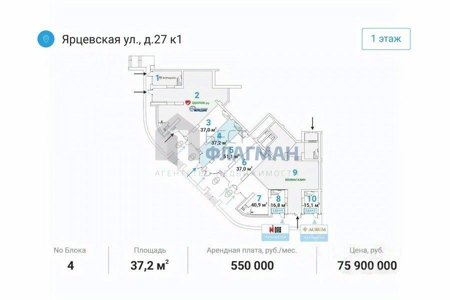 Жилой дом ''Ярцевская, 27к1 '' класса C Площадь: 37,2 м2 Арендная ставка: 157 419,4 р. за м2 в год включая НДС Стоимость площади в месяц: 488 000,0 р. включая НДС Система налогообложения: НДС Готовность: требуется отделка Этаж: 1 Планировка: открытая Наличие с/у: 1шт, Внутри Статус: свободен Высота потолков, h: 3.60м Отдельный вход Характеристики здания Адрес: Ярцевская улица, 27к1, Москва Округ: Западный административный округ Класс: C Площадь здания: 37 915,8 м2 Полезная площадь: 37 915,8 м2 Этажность: 30 Налоговая: 31 Год постройки: 2009 Безопасность: Видеонаблюдение Парковка: Стихийная, Платная открытая, На прилегающей территории Street Retail помещение торгового или свободного назначения (ПСН) площадью 37,2 м2 на 1 этаже жилого здания. Планировка — свободная (одним залом), перекрытия — ж/б, высота потолков — 3,6-4,1 м. Отлично подойдёт под любой вид деятельности: торговое помещение, магазин, ресторан, кафе, аптека, салон красоты, офис продаж, кофейня и др.