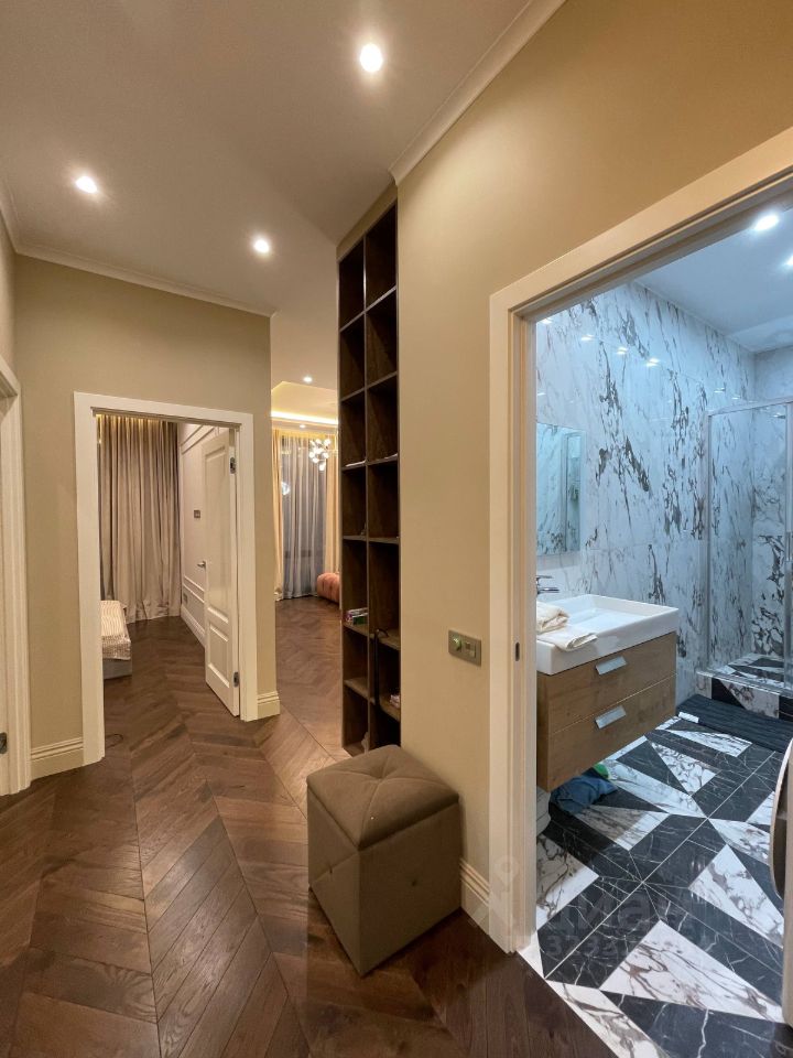ID 769796 Квартира с авторской отделкой площадью 286,8 м2 расположена в тихом переулке Остоженки. Функциональной планировкой предусмотрена просторная гостиная, столовая, кухня, сервизная, мастер-сьют с ванной комнатой, гардеробной с будуаром, две детские с ванной комнатой, комната свободного назначения (может быть спальня, кабинет или гардеробная), кабинет, гостевой санузел с постирочной. Грамотным зонированием предусмотрено изолирование приватной зоны от гостевой части квартиры. В отделке квартиры были использованы исключительно высококачественные материалы: мрамор, мозаика изор, мозаика плитки Viva & Hitit, антикварная гранитная итальянская плитка (возраст 150 лет), дубовый паркет Finex, сделанный на заказ, стены окрашены сложными оттенками серо-розового, серо-лавандового и графита. Установлен кухонный гарнитур марки Nolte, фартук облицован металлом, мебель и освещение привезены из Италии и Голландии. Квартира оборудована системой кондиционирования Daikin с увлажнением. Из окон открывается вид в сквер и тихий благоустроенный двор. Высота потолка 3,4 м.