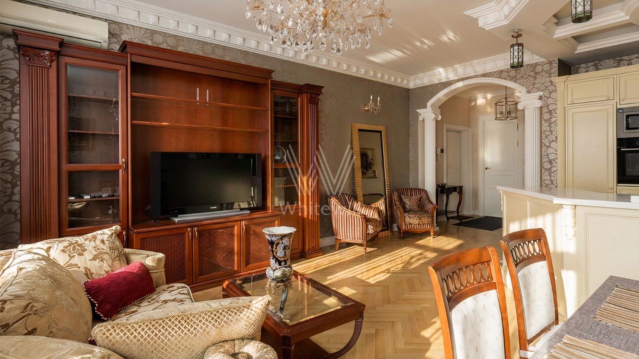 Уютная квартира с одной спальней общей площадью 80 м² в доме ''Пресненский вал, 16'' в Пресненском районе. Интерьер оформлен в классическим стиле, украшен картинами и колоннами. Спланирована кухня-гостиная с обеденной зоной, спальня с окнами в пол, ванная комната с джакузи и душем, гардеробная, холл, балкон. Квартира полностью меблирована и укомплектована бытовой техникой. Установлена система кондиционирования, стиральная и посудомоечная машина. Из окон открывается вид во двор и на ''Москва-Сити''. Комментарий эксперта. Меня зовут Ирина Бурмага — брокер компании Whitewill. Я отвечаю за аренду этого лота. Свяжитесь со мной, чтобы получить расширенную презентацию, больше фотографий или договориться о просмотре. Могу провести экскурсию по локации и познакомить вас с этим домом. ID 4 853.