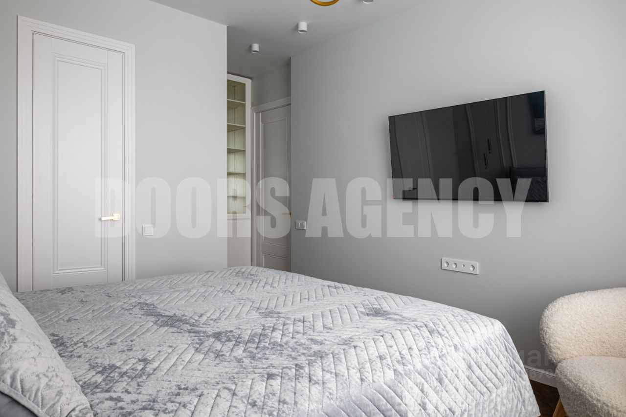 Апартамент сдается от СОБСТВЕННИКА на длительный срок от 2 лет и более. Новый 25-этажный высотный жилой дом жилой комплекс ''ЛЕВЕЛ-СТРЕШНЕВО'' Башня ЮГ самая близкая к воде и самый шикарный вид из окон. В доме на входе постоянно находится консьерж, выполнена отделка входной группы и холлов, скоростные пассажирские и грузовые лифты, огороженная внутридомовая территория с охраняемым подземным паркингом. Шикарный вид из квартиры на Москву-реку. Данные двухкомнатного апартамента: 21 этаж Общая площадь: 58 кв.м. Кухня-гостиная 25,2 кв.м., спальня 15,0 кв.м., гардеробная 3,7 кв.м., прихожая 8,7 кв.м., сан. узел 5,3 кв.м. Имеется встроенная современная кухня со всей бытовой техникой (вытяжка, электроплита, духовой шкаф, посудомоечная машина, холодильник, измельчитель отходов), водонагреватель и отдельные теплые полы в сан. узле и на кухне, мульти-сплит система кондиционеров в гостиной и в спальне, импортная сан. техника, датчики протечки воды, разводка под компьютерную сеть и Wi-Fi. В квартире подключен интернет МТС. Хорошая отделка в апартаменте - авторский дизайн, новая мебель. Имеется подземный паркинг.