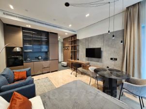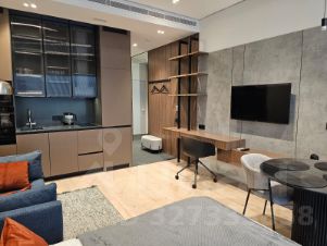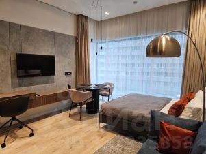 Описание интерьераСтильная студия с продуманным дизайнерским интерьером. Пространство зонировано стеклянной перегородкой с рифлёным стеклом, что создаёт ощущение отдельной спальни при сохранении света и воздуха.Интерьер выполнен в спокойной современной палитре: натуральное дерево, нейтральные оттенки, акцентные элементы. Кухня с интегрированной техникой, функциональная гостиная зона, панорамные окна наполняют квартиру светом и подчёркивают ощущение пространства.Квартира полностью готова к комфортному долгосрочному проживанию.Предоплата за 1 месяцЗалог 100 000 ₽