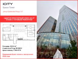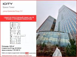 Сдается офис площадью 220 м² с видом на ТТК, расположенный на 16 этаже в башне ''Space Tower'' деловых небоскребов класса ''A'' iCity.Высокие потолки 3,75 м и панорамное остекление обеспечивают прекрасную естественную освещенность. Архитектором проекта является всемирно знаменитый Хельмут Ян.БЦ имеет 24 пассажирских лифта + 1 грузовой, а также парковку на 942 машиноместа.Работы по отделке осуществляет компания CRE construction.Помещение будет готово к заезду в середине мая 2026 года.Также к данному объекту предлагается в аренду машиноместо.Оперативный показ.Готовы к работе с агентами.Использование и копирование любых материалов без разрешения запрещено.