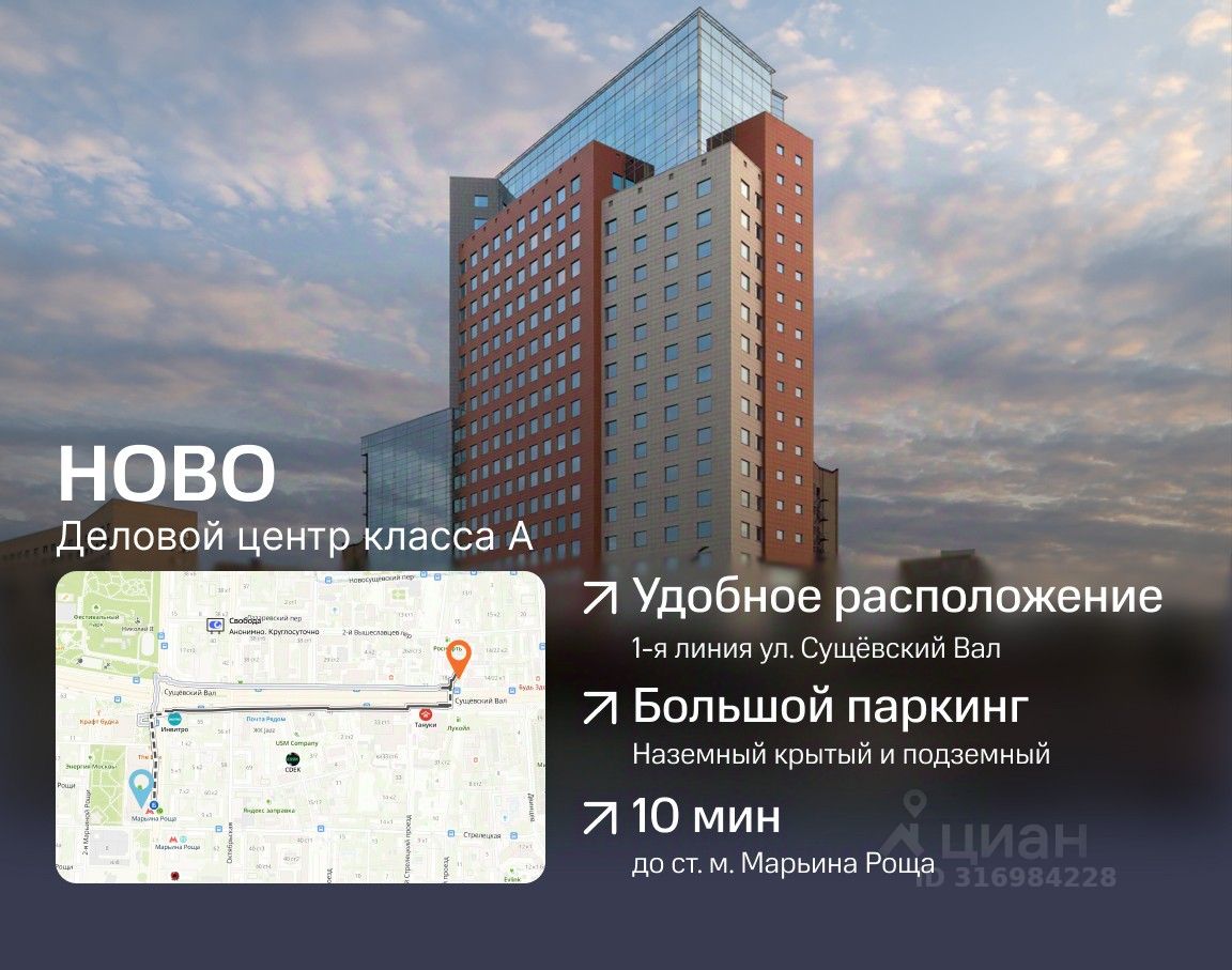 Бизнес-центр НОВО Сервисные и классические офисы в районе Марьина Роща, прямая аренда без комиссии Бизнес-центр расположен в районе с хорошей транспортной доступностью, вблизи крупных магистралей города Москва. Широкий выбор площадей по метражу, есть возможность аренды помещения с мебелью. ПРЕИМУЩЕСТВА ЛОКАЦИИ: • прекрасные видовые характеристики, • доступ к террасе, • подземный многоуровневый паркинг на 371 место, • близкое расположение станций метро: Марьина роща (10 минут пешком), Савёловская (12 минут), Менделеевская (15 минут), • быстрое сообщение с крупными улицами города: выход на улицу Новослободская, Бутырская улица и Ленинградский проспект. Классические офисы: • площади по ставке от 45 000 ?/м²/год, • смешанная планировка — open space, кабинеты, переговорные, • современный дизайн и качественная отделка, • в арендную ставку включены НДС и OPEX. Сервисные офисы: • площади по ставке от 68 000 ?/м²/год, • смешанная планировка (open space + кабинеты), • премиальный уровень отделки, • все включено: НДС, ОРЕХ, коммунальные услуги, уборка и пр. Арендаторы выбирают бизнес-центр за удобное расположение, современные инженерные системы, большой паркинг и эффективные планировки этажей. Необычные архитектурные решения, панорамное остекление и система подсветки сделали бизнес-центр доминантой района. Готовы оперативно организовать просмотр в удобное время и предоставить PDF-презентацию, план, а также видеотур по запросу.