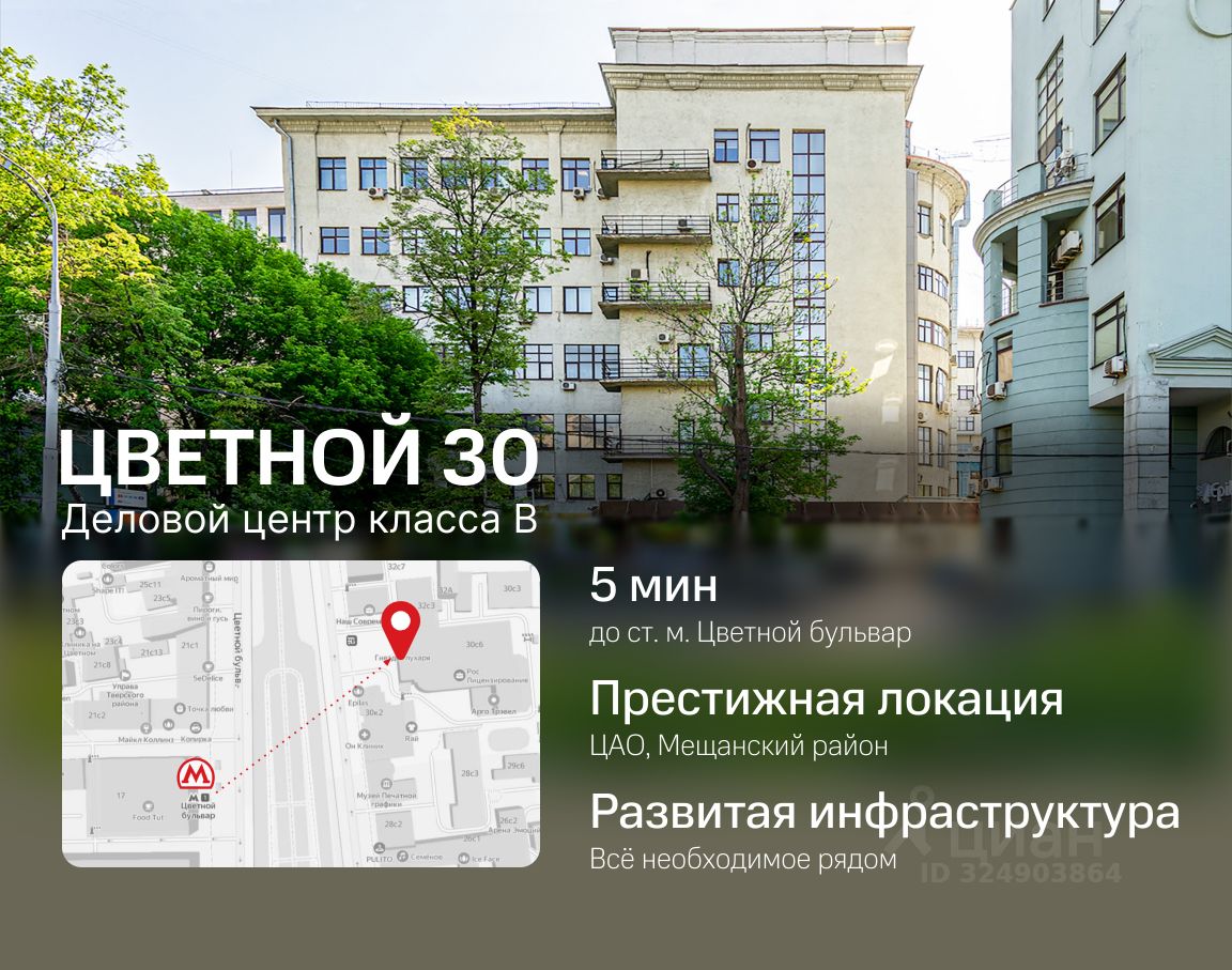 ЦВЕТНОЙ 30 Цветной 30 — это современный бизнес-центр В-класса. Здание сочетает в себе исторический архитектурный облик и современную инженерию. Офис подойдёт всем, кто ценит комфорт и стремится подчеркнуть престиж своей компании. Бизнес-центр находится в Мещанском районе, в сотне метров от Садового кольца и паре минут ходьбы от двух станций метро. ПРЕИМУЩЕСТВА: • безопасность: контроль доступа, круглосуточная охрана и видеонаблюдение, • развитая инфраструктура: кофейни, кафе, бары и рестораны под боком, сквер Цветной Бульвар через дорогу, банки, цветочные салоны, клиники и пр. в шаговой доступности, • современные офисы с качественной отделкой и функциональными планировками, • 5 минут до станции Цветной бульвар и 7 минут до Трубной, • паркинг наземный открытый на 50 машиномест ФИН.УСЛОВИЯ: • в арендную ставку включены НДС и ОРЕХ, • арендная ставка от 908 500 ?/мес (46 000 ?/м²/год), • прямой договор аренды с собственником без комиссии для клиента. Готовы оперативно организовать просмотр в удобное время и предоставить PDF-презентацию, план, а также видеотур по запросу.