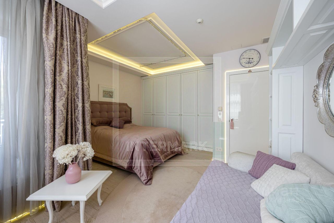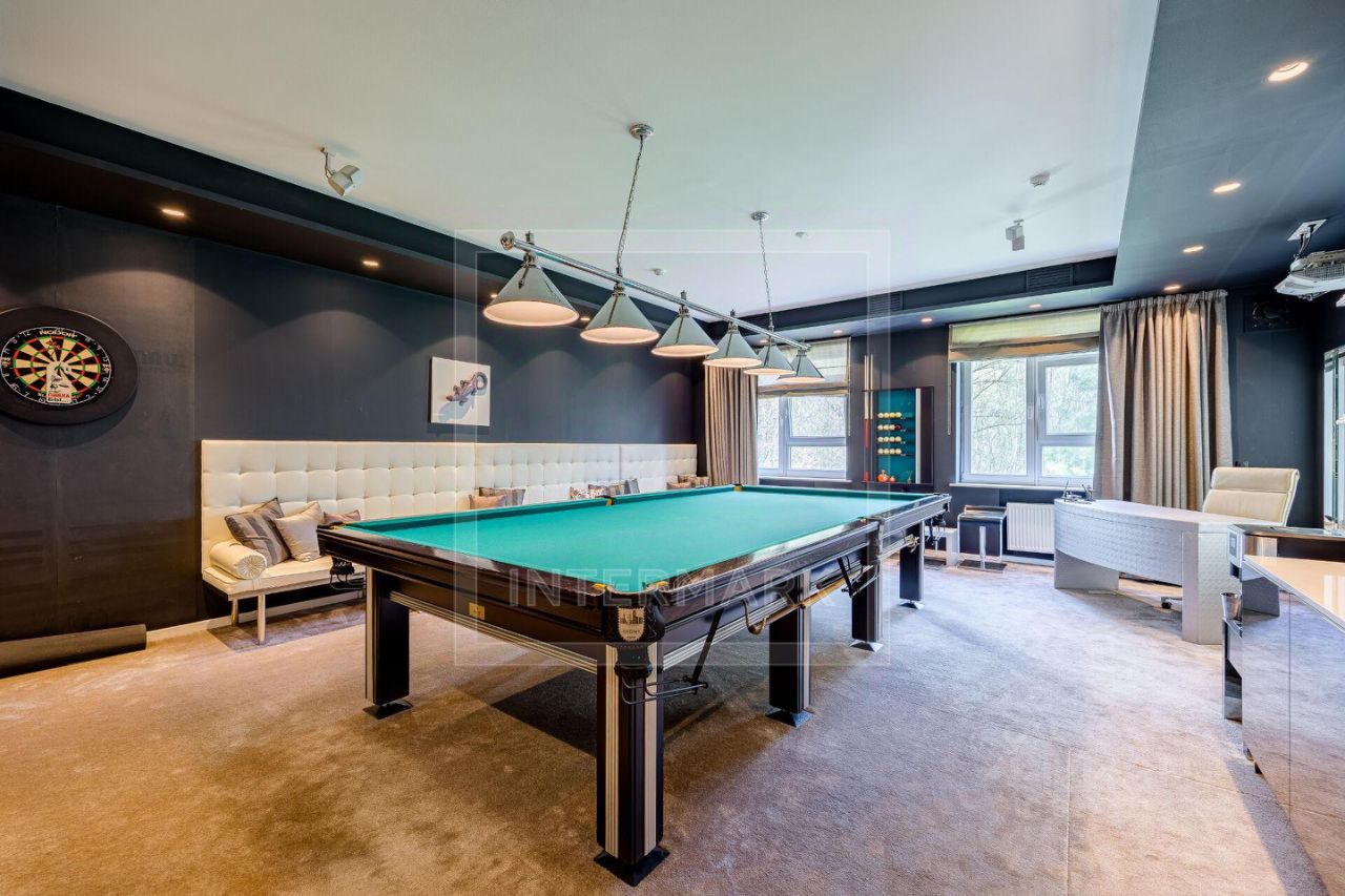 ID 46991: Современный роскошный дом в охраняемом жилом комплексе ''Остров фантазий'' с авторской отделкой от известного дизайнера, полностью оборудован и меблирован, готов для комфортного проживания. Функциональная планировка для семьи: 1 этаж: холл с гардеробной, постирочная/хозяйственная комната, гостевая спальня со своей ванной комнатой, кабинет/гостевая комната, балкон, бильярдная, спа-комплекс с бассейном, хамам, душевой и тренажерами, отдельная гардеробная и выход в гараж на 3 машины, оснащенный зарядкой для электромобилей. 2 этаж: отдельная кухня с 2 выходами, элегантная и просторная гостиная с камином, множеством окон и выходом на террасу, обеденная зона с аквариумом, главная спальня с 2 гардеробными, ванной комнатой (ванна, душ) и выходом на балкон, детский блок 3 спальни, 2 ванные комнаты, 3 этаж: выход на эксплуатируемую крышу патио с летней кухней и зоной для барбекю, система хранения. В доме много света и воздуха, вид из окон на зелень, сосны, пихты. Уникальное расположение в экологически чистом районе на западе Москвы, с собственным причалом для лодок и яхт, частный пляж, детские и спортивными площадками, по соседству с гребным каналом и гольф-клубом. Территория комплекса круглосуточной охраняется, установлена пропускная система въезда. В комплексе 4 детских площадки, футбольная площадка, территория для организации барбекю и детских праздников. PLEASE FEEL FREE TO CONTACT INTERMARK REAL ESTATE TO GET DETAILED INFORMATION OR TO SET UP A VIEWING! 24/7 HELP DESK SERVICE WITH ENGLISH -SPEAKING OPERATORS В доме: С мебелью, М/место в подземном паркинге, Парковка, Бассейн, Посудомоечная машина, Сушильная машина, Бойлер, Душевая кабина, Теплые полы, Сауна, Камин, Спутниковое/кабельное телевидение, Тренажерный зал, Видеонаблюдение, Гараж, Интернет, Терраса, Балкон, Видовая квартира, Можно с детьми, Изолированная кухня, Ванна, Интерьер в современном стиле, Гардеробная комната, Около воды, Spa-зона, Лесной участок, Ремонт - дизайнерский, Мебель в комнатах, Телефон, Телевизор, Мебель на кухне
