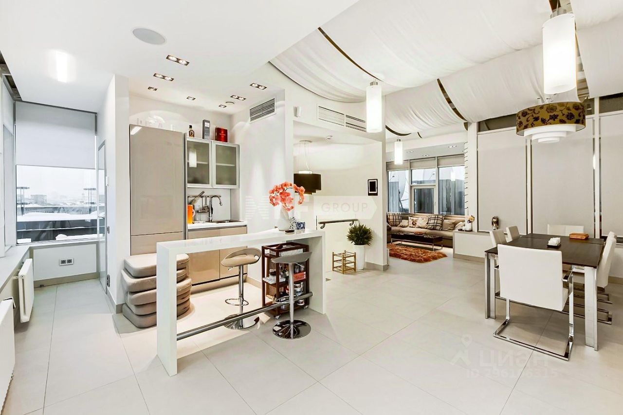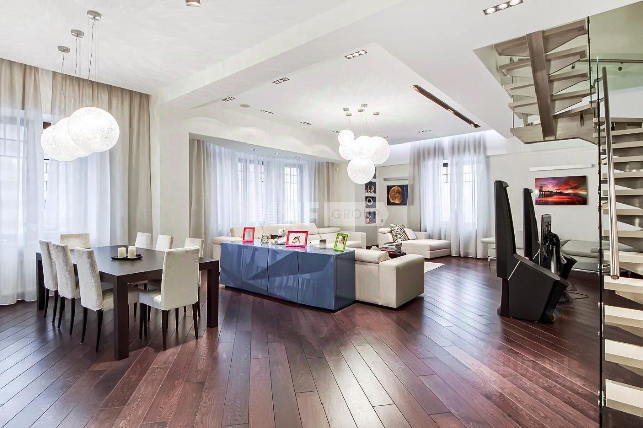 Лот: 38534. Эксклюзивный трёхуровневый пентхаус под ключ с террасой в клубном жилом комплексе ''Венский дом'' предлагает уникальное сочетание роскоши, пространства и панорамных видов. Расположенный на последних этажах 9-этажной секции, пентхаус открывает потрясающие виды на храм Христа Спасителя, высотки Москвы и ММДЦ ''Москва-Сити''. Общая площадь апартаментов составляет 340 кв.м, площадь террасы - 86 кв.м. Выполнена отделка в современном стиле с использованием премиальных материалов. Пространство оборудовано дизайнерской мебелью, системой ''умный дом'', подогревом полов, центральным кондиционированием и деревянными окнами. Кухня оснащена премиальной техникой Guggenau и Kuppersbusch.