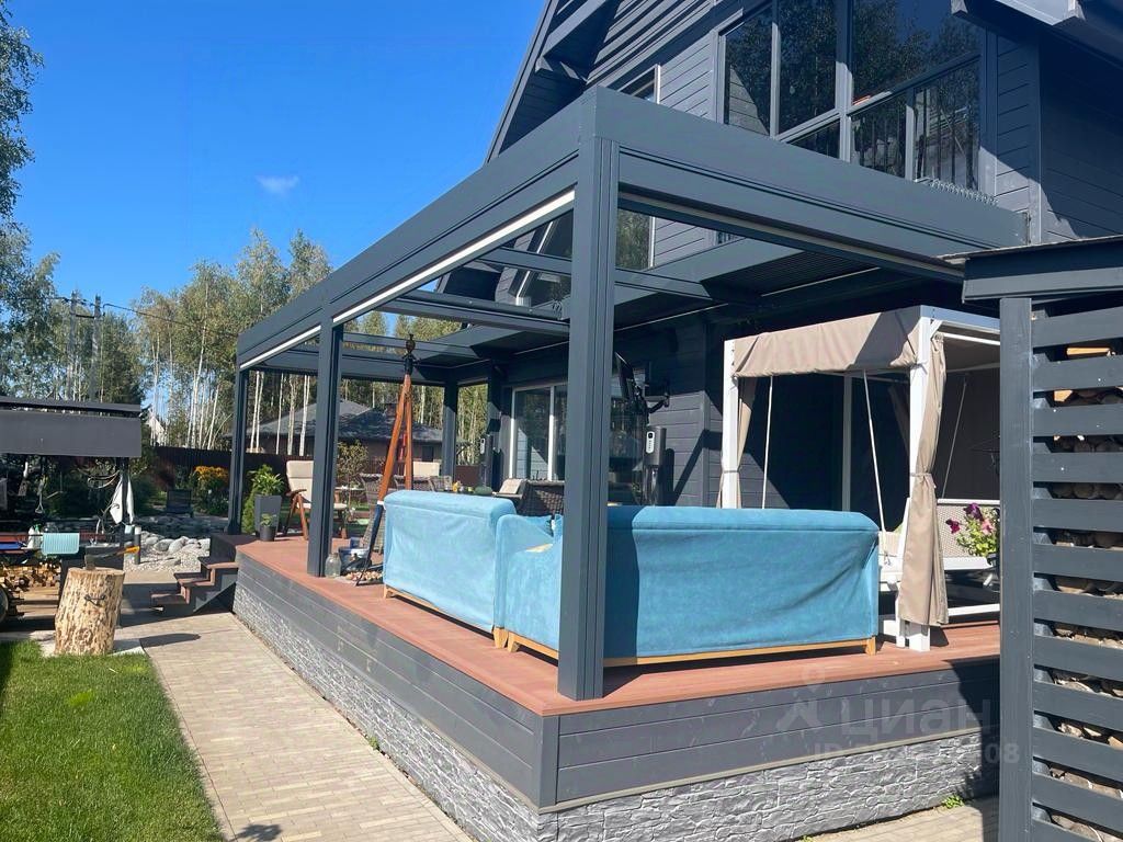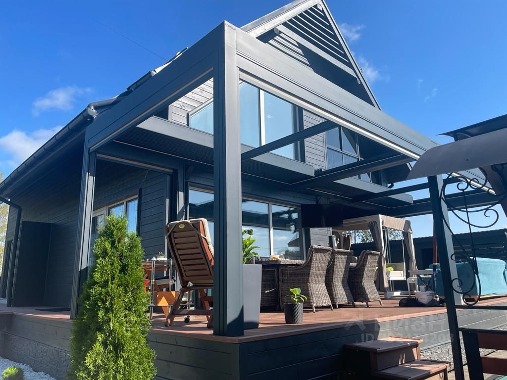 Главное место дачи, делающее ее настоящим местом отдыха и расслабления - крытая биоклиматическая терраса площадью 55 !!! квадратных метров, из устойчивых к климатическим воздействиям алюминиевых профилей, оснащенных специальными уплотнителями для герметичной защиты от осадков. Управление крышей и боковыми защитными экранами с пульта.