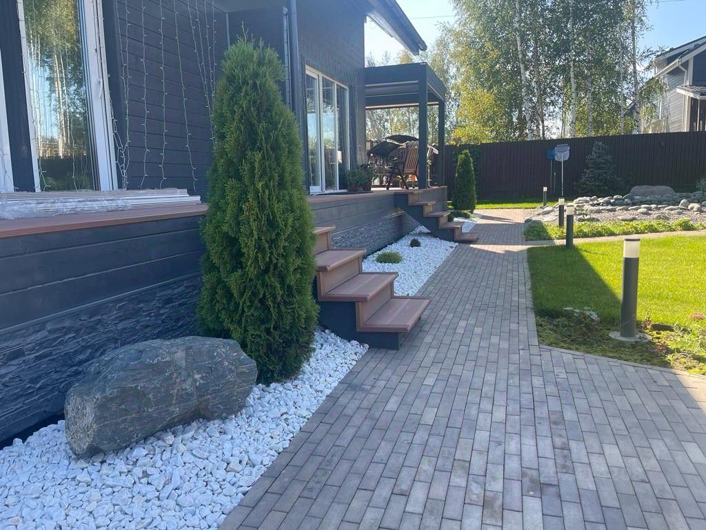 Площадка из вибропрессованной плитки - 340 кв. м., парковка, дорожки, всё выполнено качественно, с устройством бетонного основания.