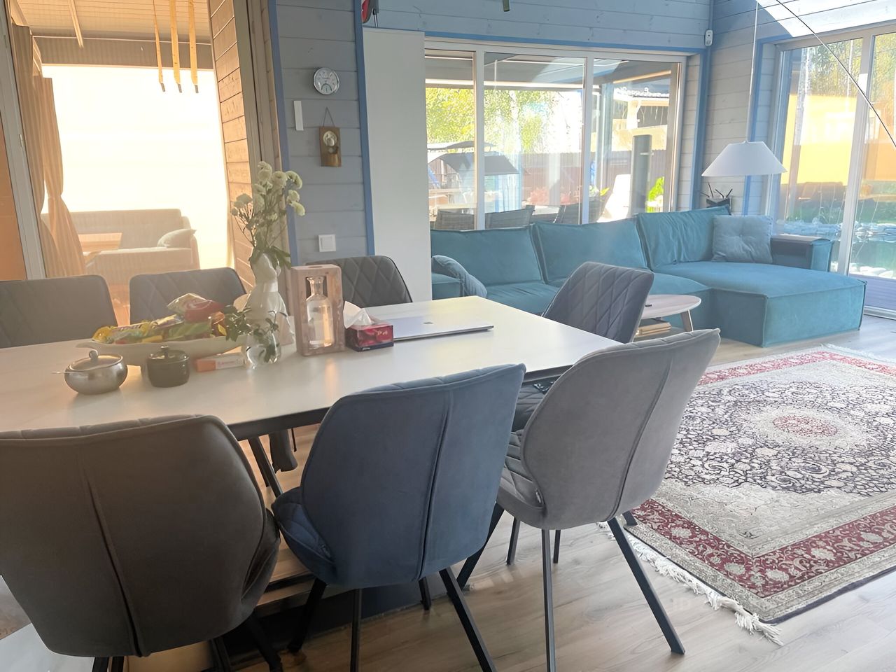 В доме: панорамные окна, москитные раздвижные двери, теплый пол по всему первому этажу, умная система управления отоплением (в зависимости от температуры с возможностью управления через приложение), встроенные шкафы, дорогая система очистки воды, интернет.