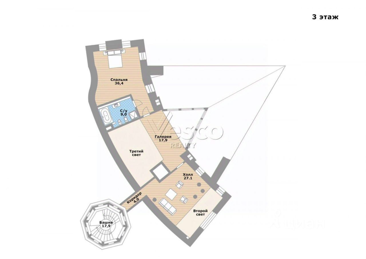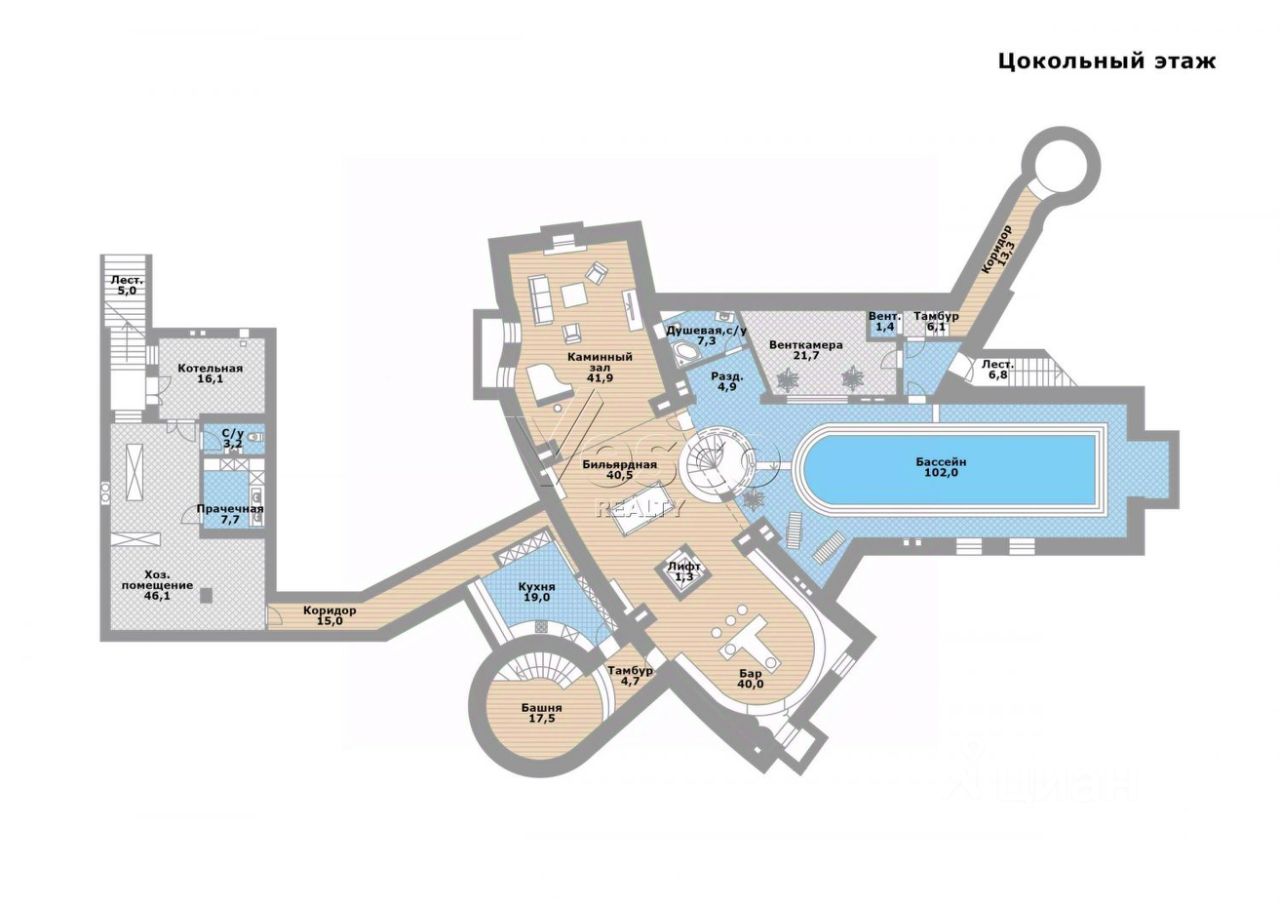 Особенности планировки: 4 спальни, панорамные окна, второй и третий свет, бассейн + сауна + хаммам, бильярдная, бар, каминный зал, лифт, башня-библиотека/винный погреб.