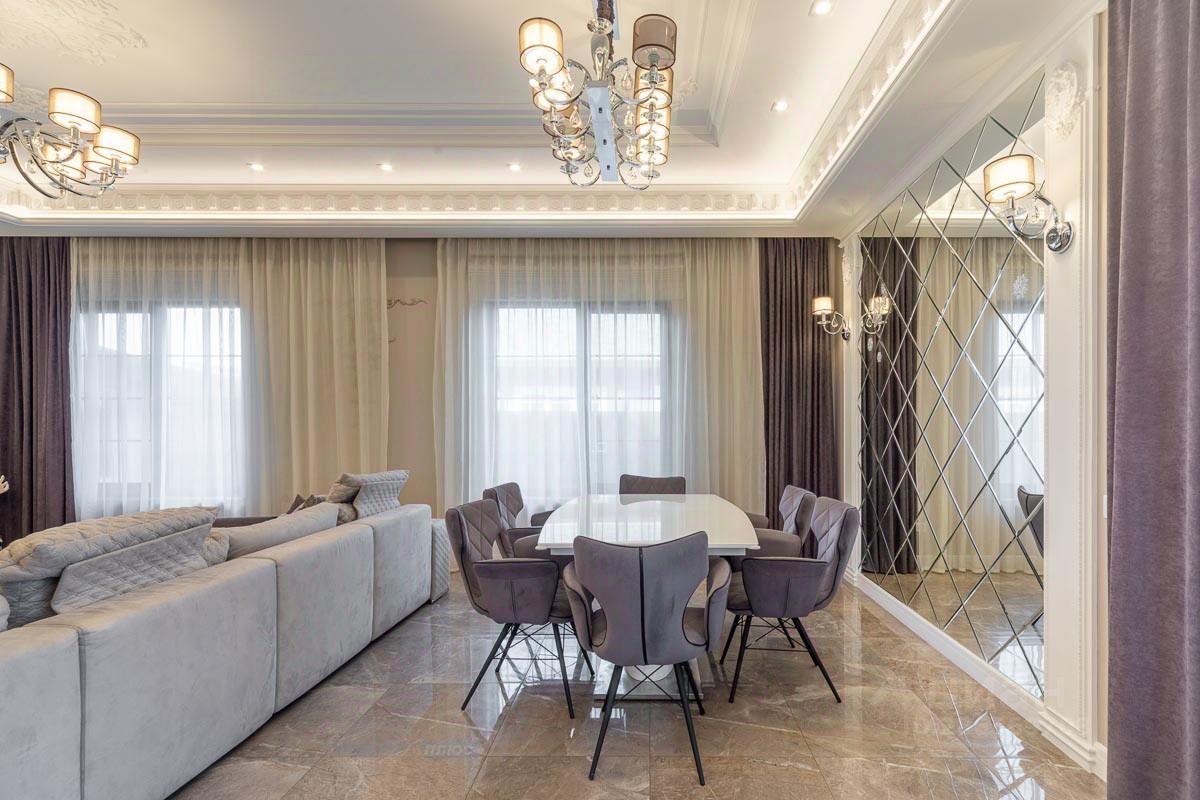 В отделке дома использовались только премиальные материалы (мраморные столешницы и подоконники, тактильная паркетная доска, итальянская плитка). Реализованы функциональные решения: электрошторы, измельчитель для кухни, сауна с парогенератором, энергосберегающие стены, водяной теплый пол, защищенные стеклопакеты, генератор для бесперебойного резервного энергоснабжения, 4 выхода в разные стороны дома. Проект создан архитектурным бюро из Чехии с учетом особенностей климата Московской области.