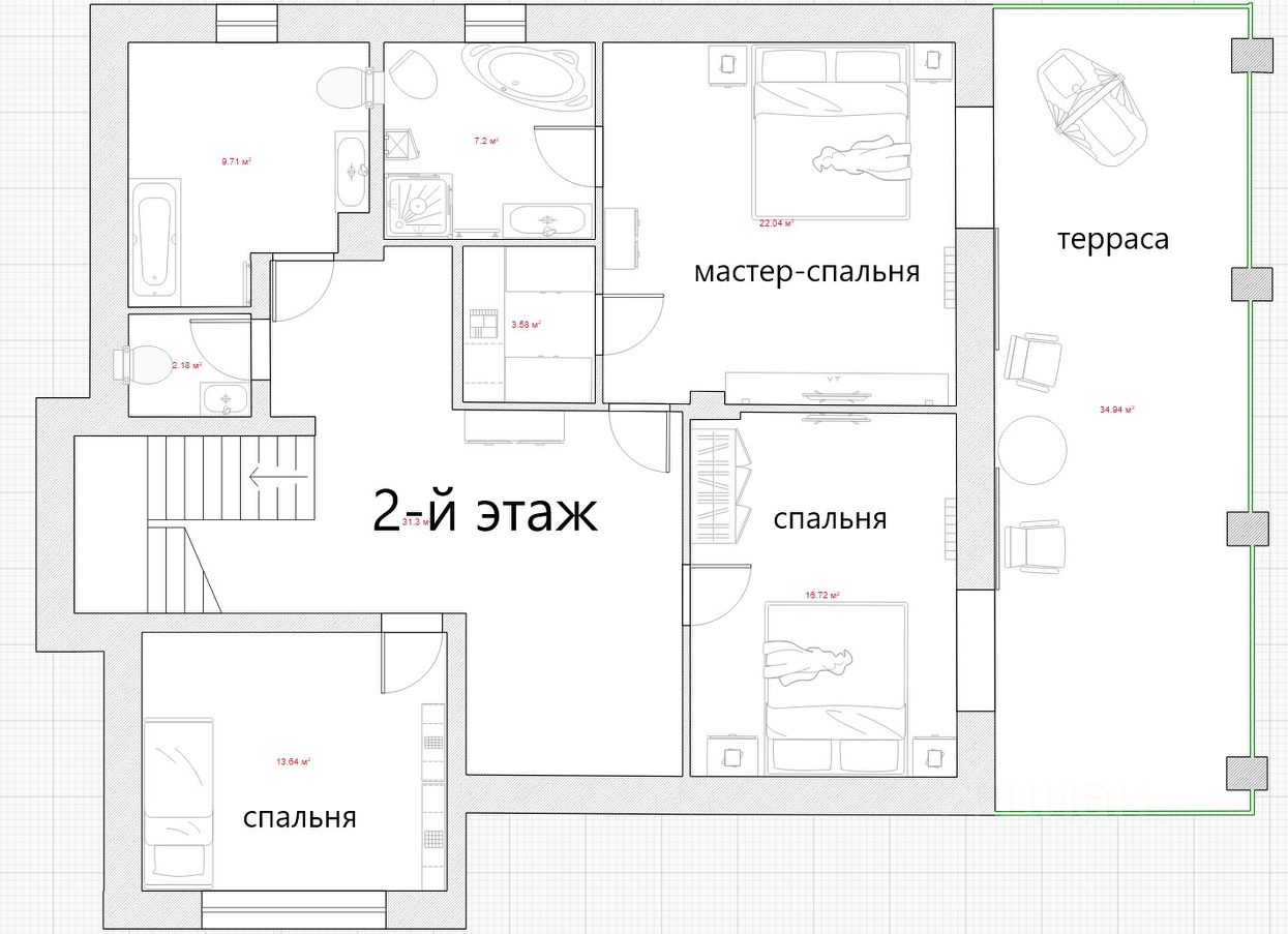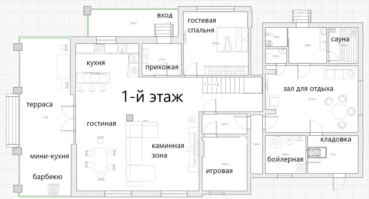 Планировка первого этажа: Функциональная кухня + остров Просторная гостиная с настоящим камином Игровая комната Гостевая спальня Банный комплекс (русская и финская сауна Harvia, зал для отдыха, душевая, санузел) Ванная комната Выход на большую террасу с зоной барбекю, мини-кухней и зоной отдыха Второй этаж: Мастер-спальня с гардеробной и своим выходом на видовую террасу Спальня c выходом на видовую террасу Спальня/рабочий кабинет Ванная комната Видовая терраса и зона релакса