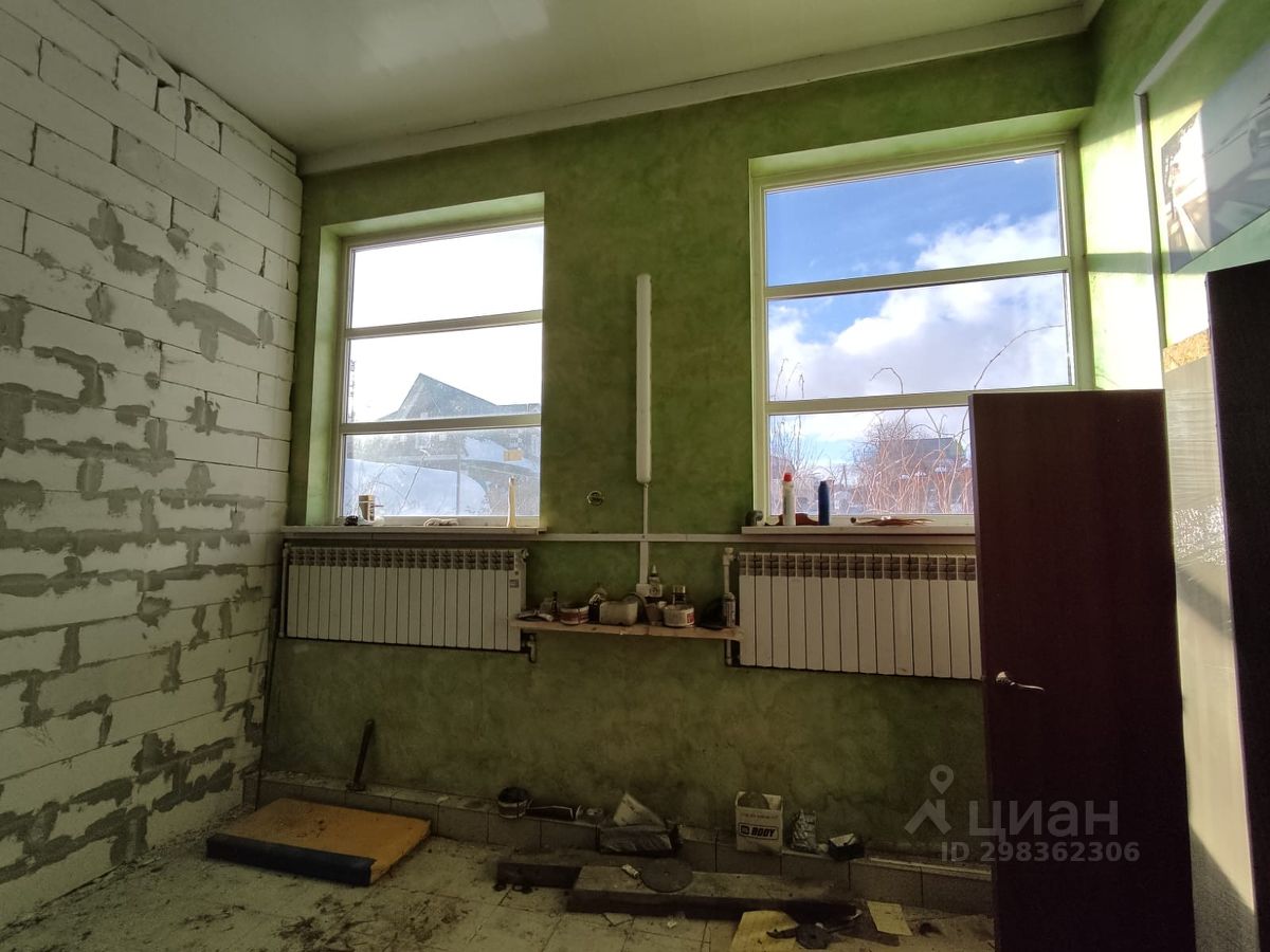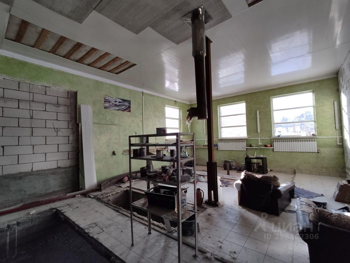 Дом с назначением - жилой 125,9 м2 (можно регистрироваться). Построен на ленточном фундаменте из газобетонных блоков. Высота потолков 4 м. Здание раньше использовалось как мастерская. Имеется два помещения: однообъемное пространство 80 м2 (с подвалом) и 46 м2 (есть подъемные гаражные ворота). Есть навес-двор при входе. Коммуникации - подключено электричество 15 кВт, газ - по границе участка.