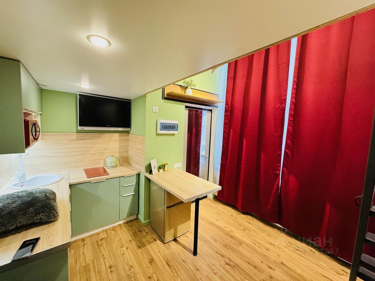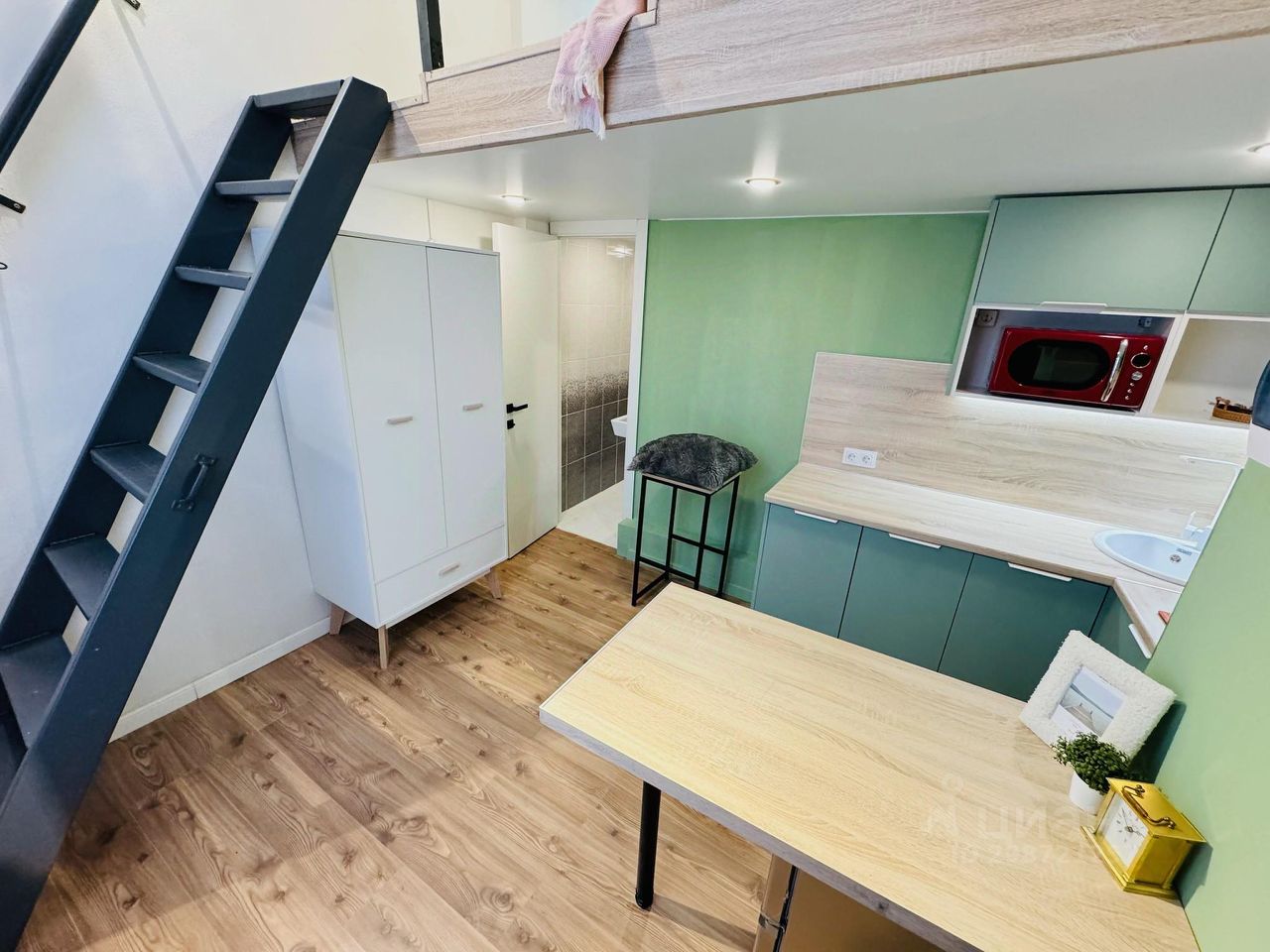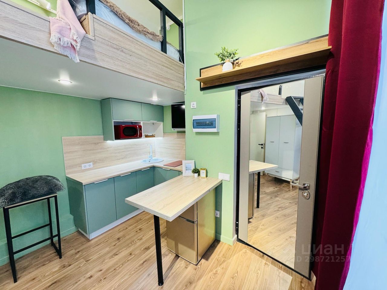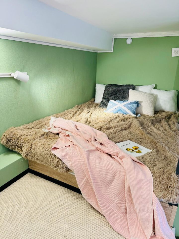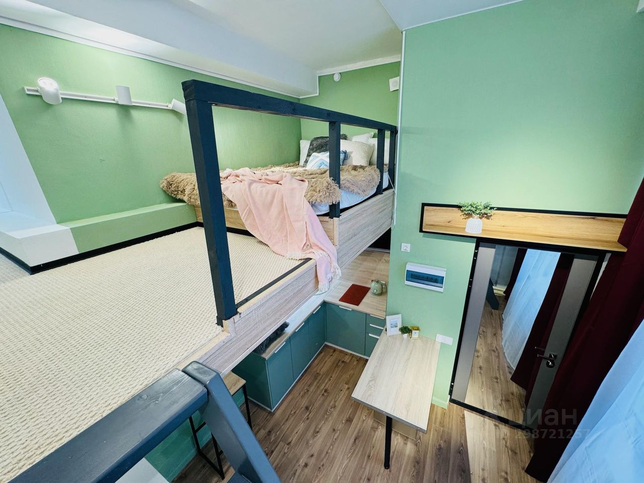 О самом лофте: имеет два этажа (12,9+10) и панорамное окно, оборудован всем необходимым: кухня с холодильником, плитой, микроволновкой, чайником. Стиральная машина, много мест для хранения, мини-гардеробная на 2 этаже. Двуспальная кровать, подходит для размещения двух человек. Вся техника новая, на гарантии.
